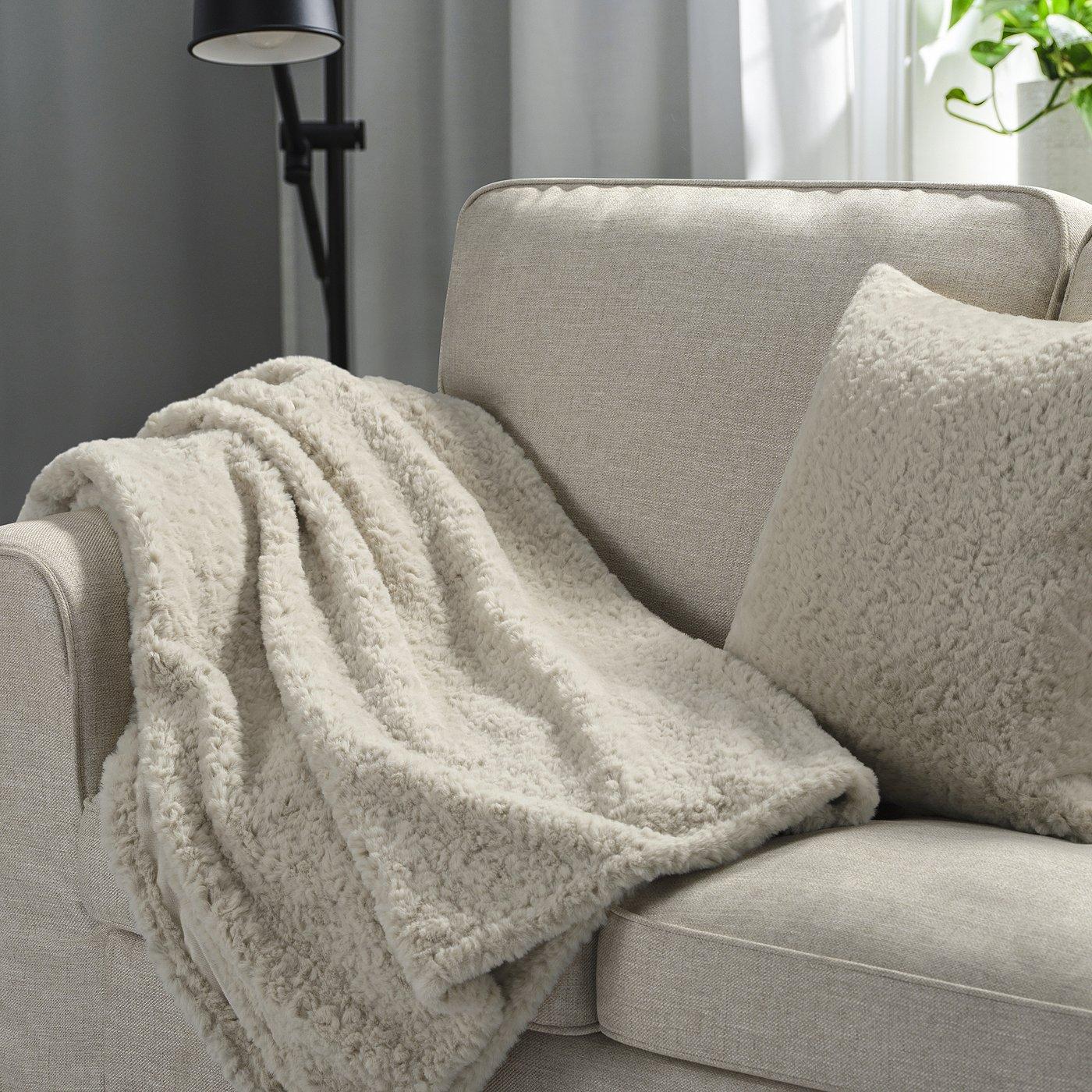 Прикосновение к пушистой бежевой наволочке и пледу создает ощущение, будто вы гладите мягкий мех, хотя они изготовлены из 100% переработанного полиэстера. Идеальный дуэт для тепла и уюта.