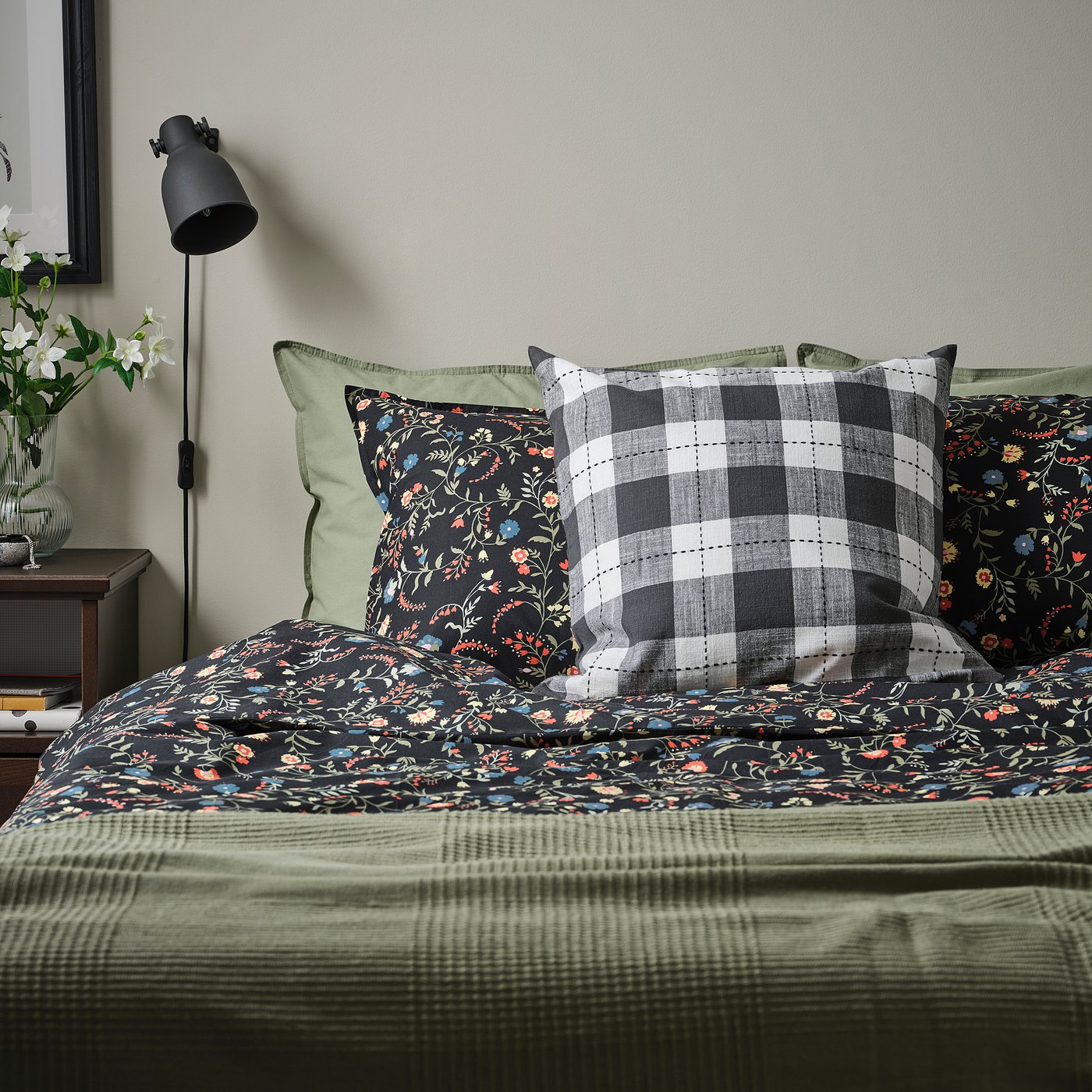 Чехол SVAMPFLY с традиционным антрацитовым клетчатым узором создаст уютную атмосферу на вашей кровати, диване или любимом кресле. Он соткан из окрашенной хлопковой пряжи и украшен рельефной строчкой.