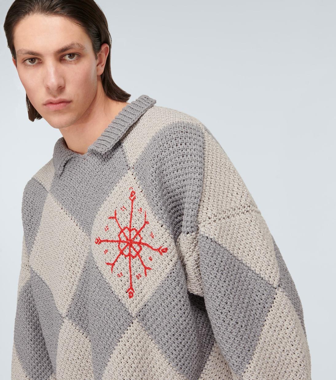 Adish использует традиционные элементы ручной работы, отдавая дань уважения израильско-палестинскому происхождению бренда. Этот свитер с воротником-трубой, выполненный из хлопка с жаккардовым узором в шахматную клетку, имеет вставку с насечками, отделку ребристым трикотажем и контрастную вышивку на груди.