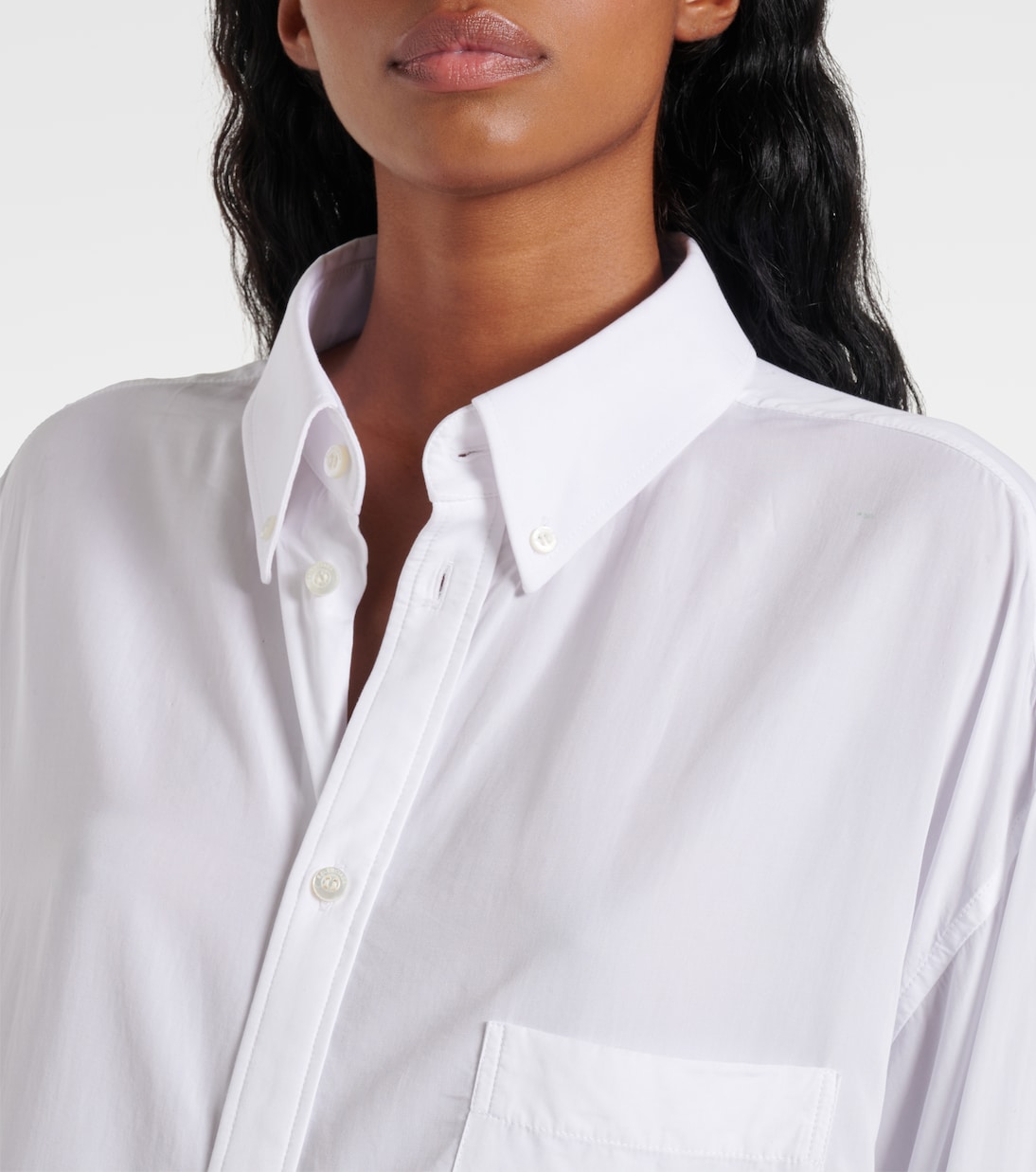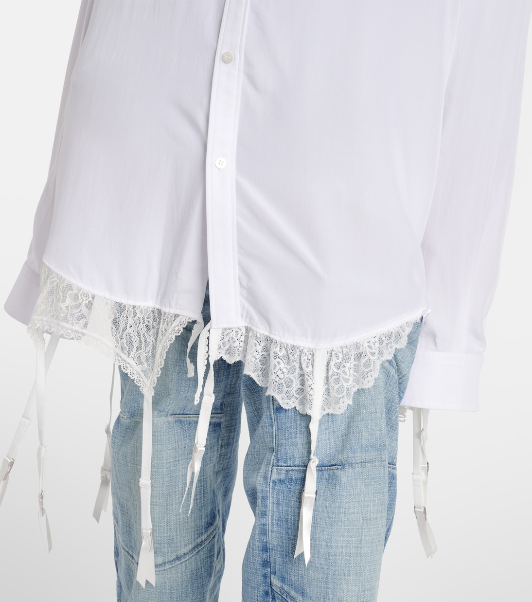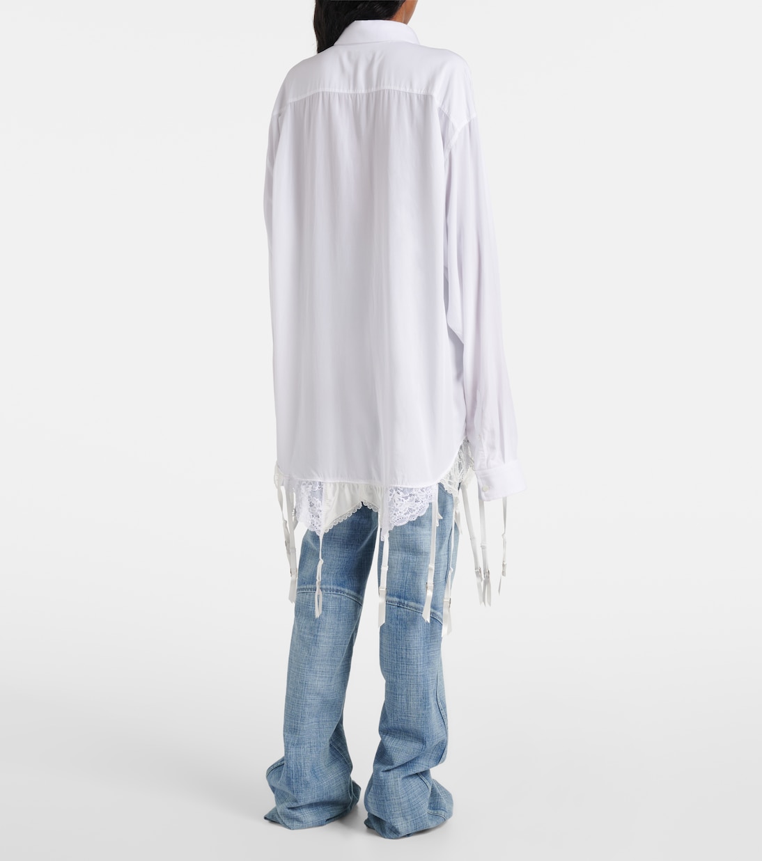 Balenciaga берет классическую хлопковую рубашку и дополняет ее деталями в стиле нижнего белья, такими как подвязки для чулок и кружево. Свободный силуэт добавляет драматизма с рукавами, которые выходят за пределы рук, и подолом, который касается бедер.