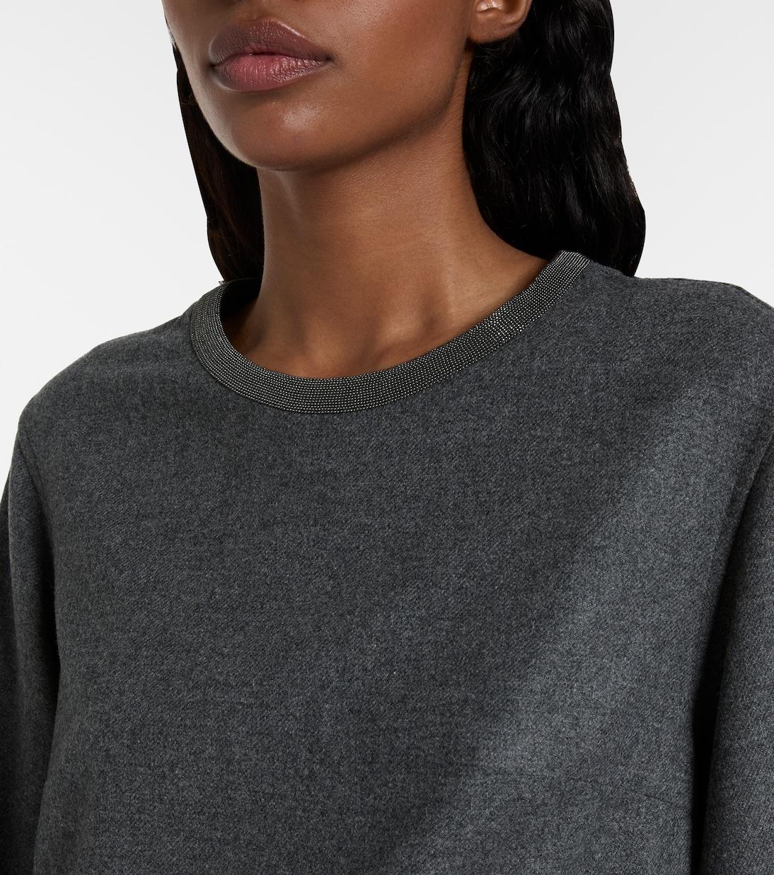 Brunello Cucinelli выводит повседневную элегантность на новый уровень с помощью этого изысканного мини-платья. Изготовленный из смеси шерсти и кашемира, этот дизайн отличается прямым силуэтом с объемными рукавами-фонариками.