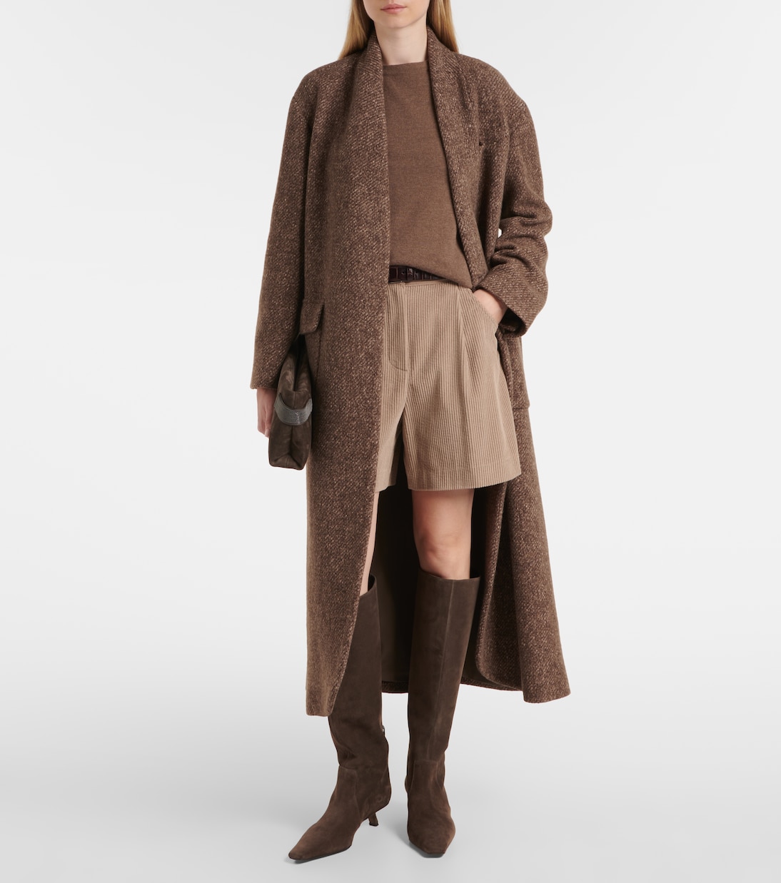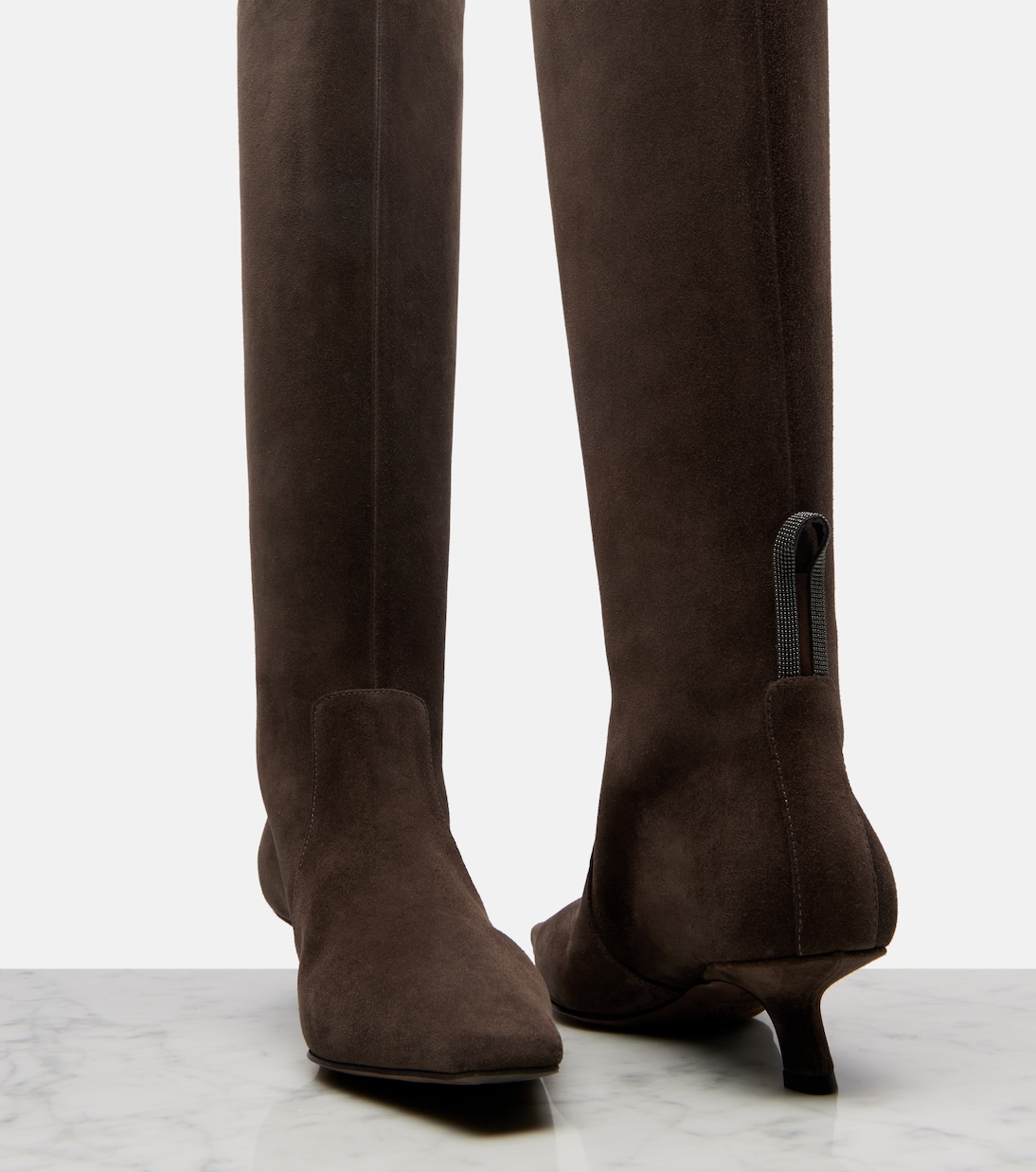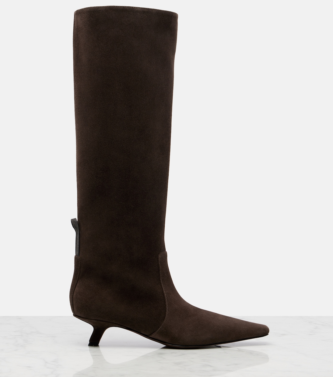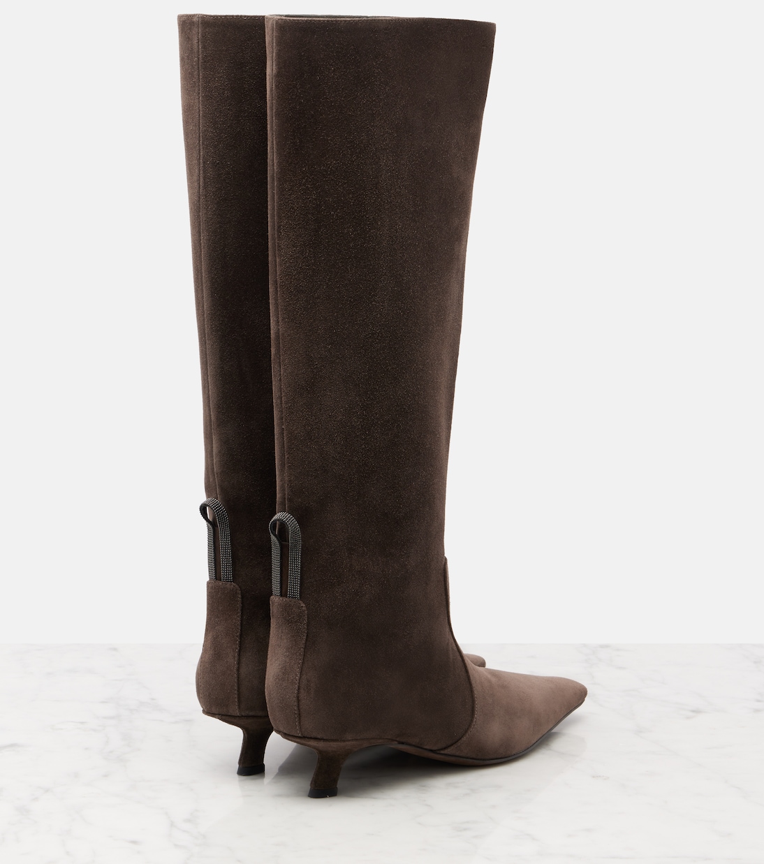 Brunello Cucinelli олицетворяет собой изысканное итальянское мастерство и непреходящую элегантность. Эти высокие сапоги выполнены из мягкой замши и отличаются изысканным острым носком в сочетании с изящным каблуком-рюмочкой и фирменными бусинами Monili.