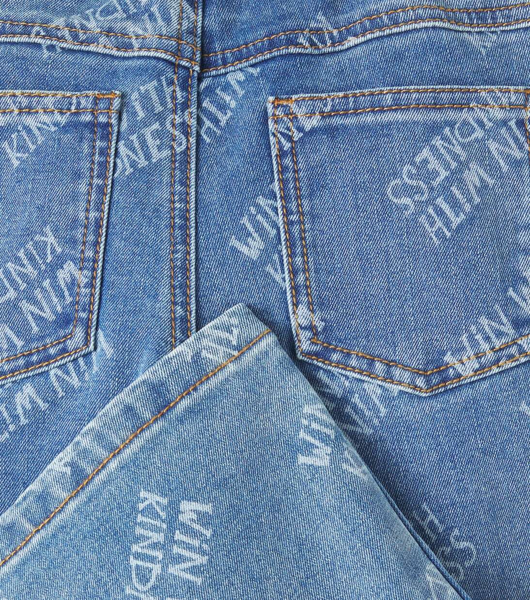 Jellymallow, название которого образовано от сочетания слов желе и зефир, воплощает невинность и волшебство детства. Джинсы Kindness прямого силуэта с принтованной надписью.