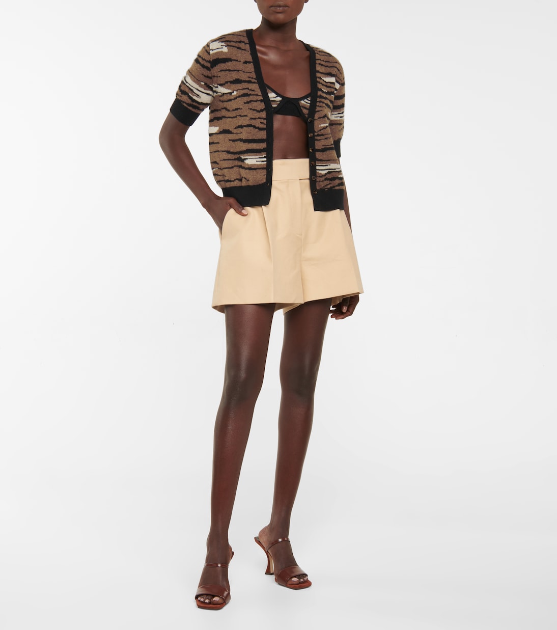 KHAITE обновил свой фирменный бюстгальтер-бралетт Eda с жаккардовым принтом с тигровым принтом. Удобный крой выполнен из чистого мягкого кашемира, имеет ребристую вязку по центру для эластичности и контрастные бретели.