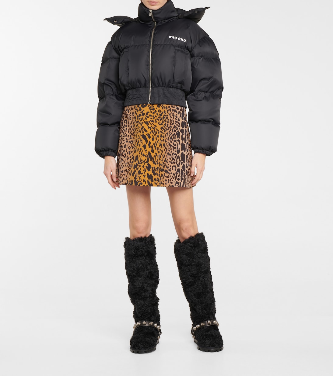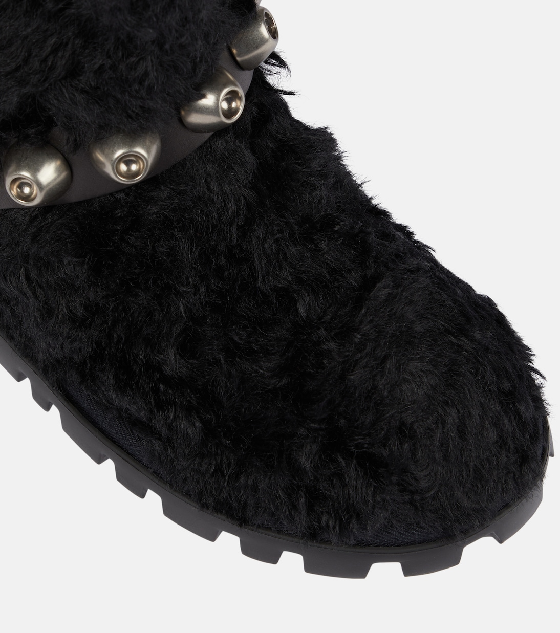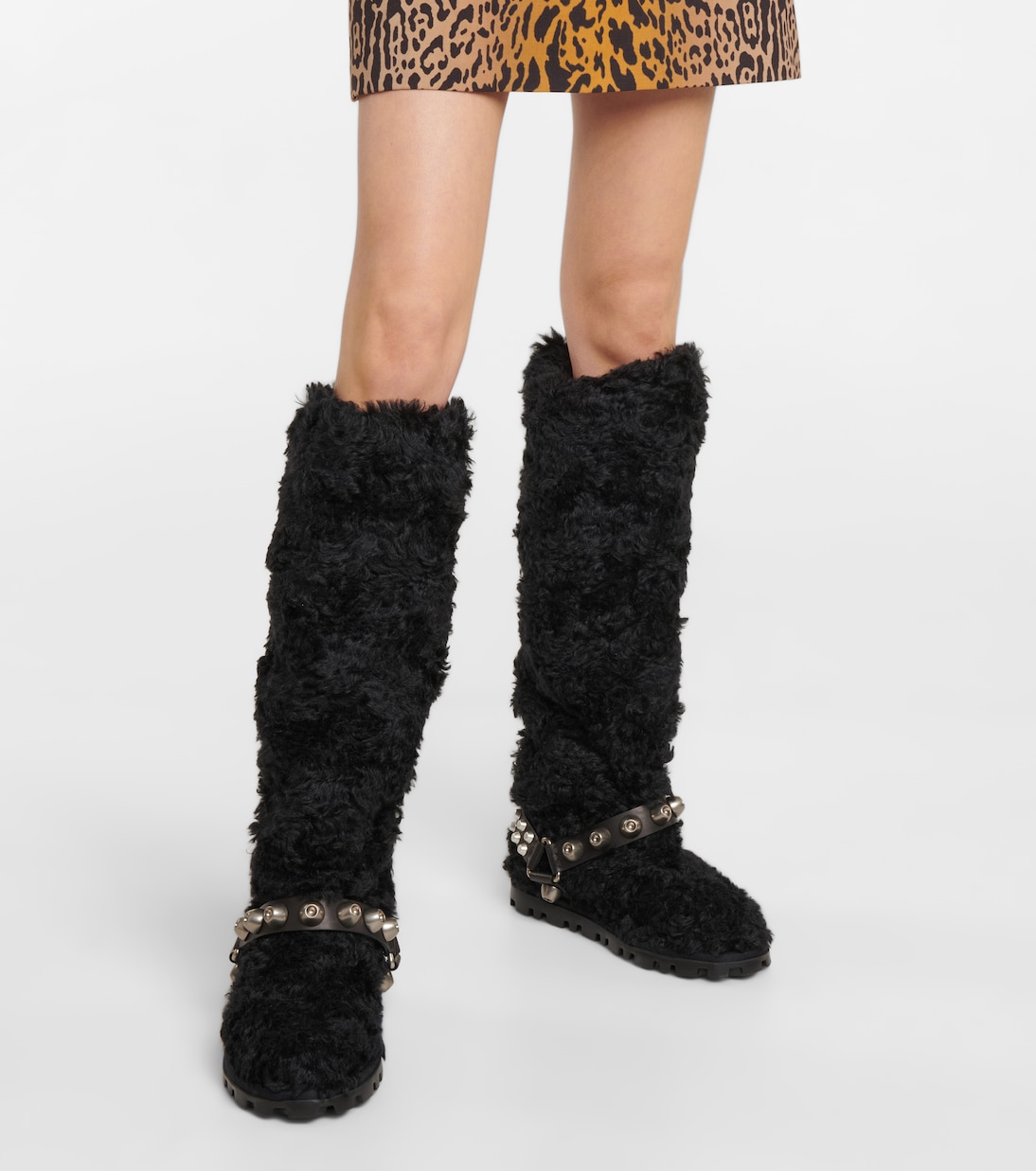 Miu Miu смело подходит к созданию зимней обуви, представив эти черные сапоги до колена из искусственной овчины. Кожаные шлейки с заклепками придают этой паре изюминку, а массивная рифленая подошва подчеркивает массивный силуэт.
