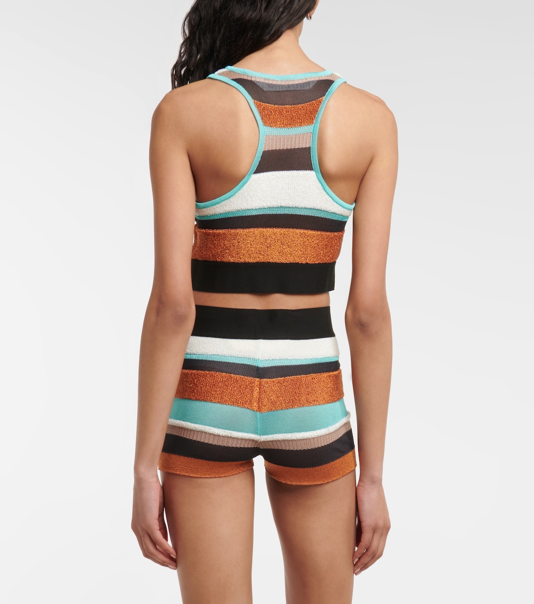 Palm Angels возвращает стиль ретро с помощью своих трикотажных шорт с полосками люрекса. Этот разноцветный, мерцающий дизайн включает в себя толстый эластичный пояс с логотипом, выполненным крупным белым принтом.