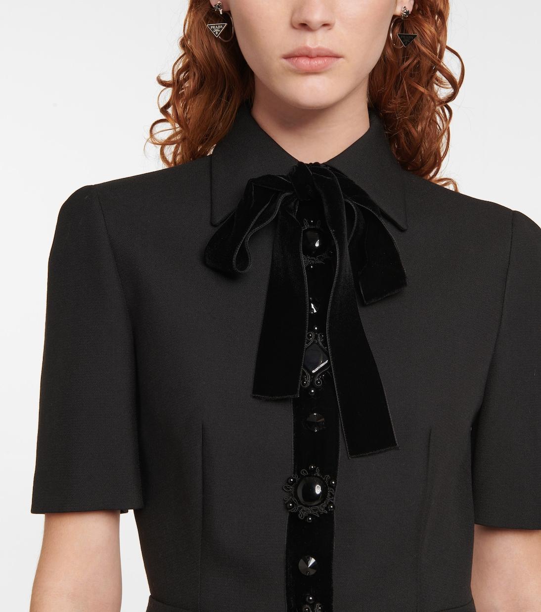 Prada умеет создавать ретро-образы и придавать им совершенно новый вид, как в этом черном платье миди. Платье А-силуэта из чистой шерсти имеет переднюю часть с полуоткрытой планкой и бархатной отделкой. Носите их с туфлями-лодочками Mary Jane и носками для создания фирменного офисного образа.