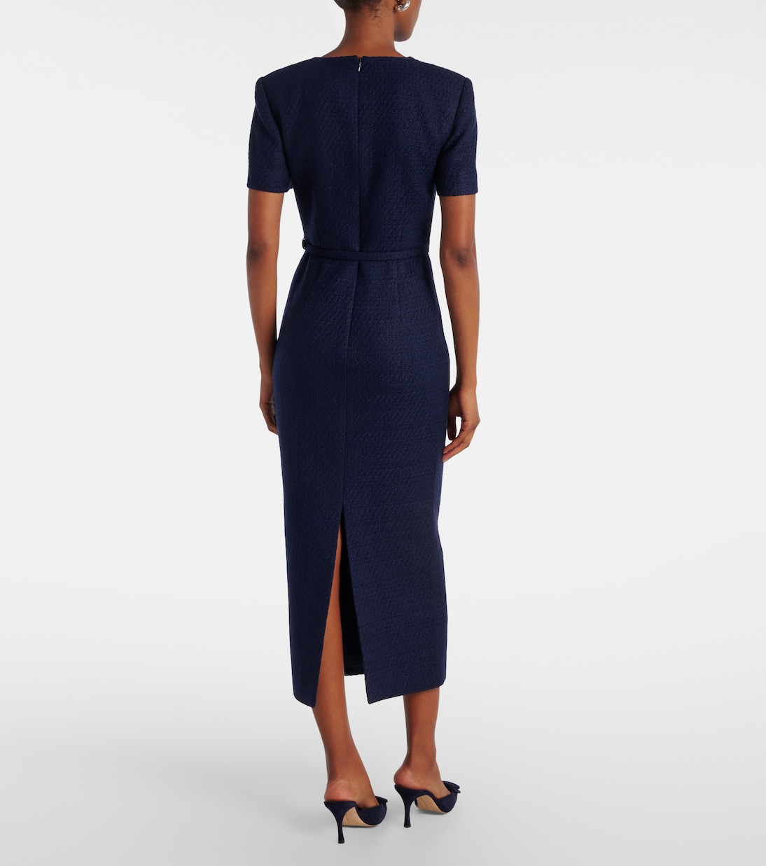 Roland Mouret прославился благодаря элегантному стилю черный галстук и умелому использованию драпировок. Это платье миди из темно-синего букле украшено съемной подвеской на плече и поясом на талии.