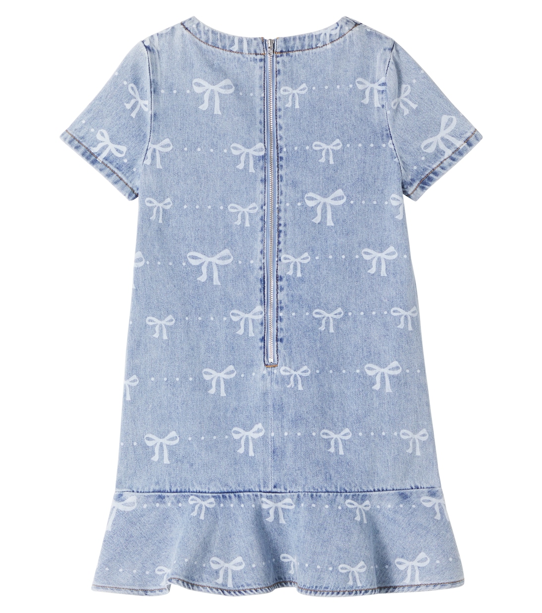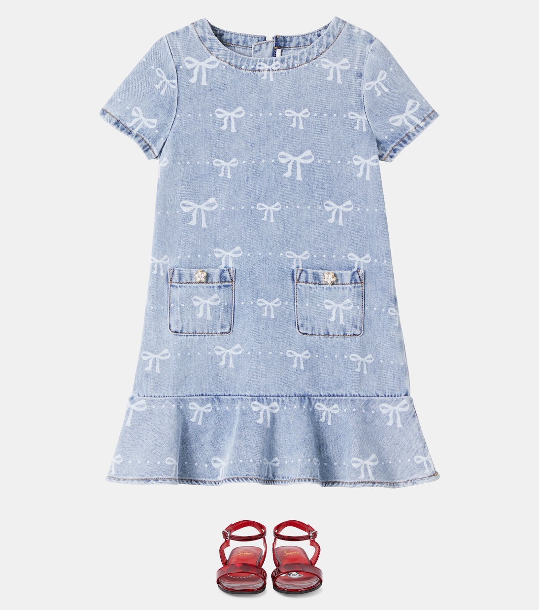 Self-Portrait Kids предлагает очаровательные платья для вечеринок в миниатюрных размерах. Эта модель выполнена из денима и дополнена принтом в виде бантов по всей поверхности.