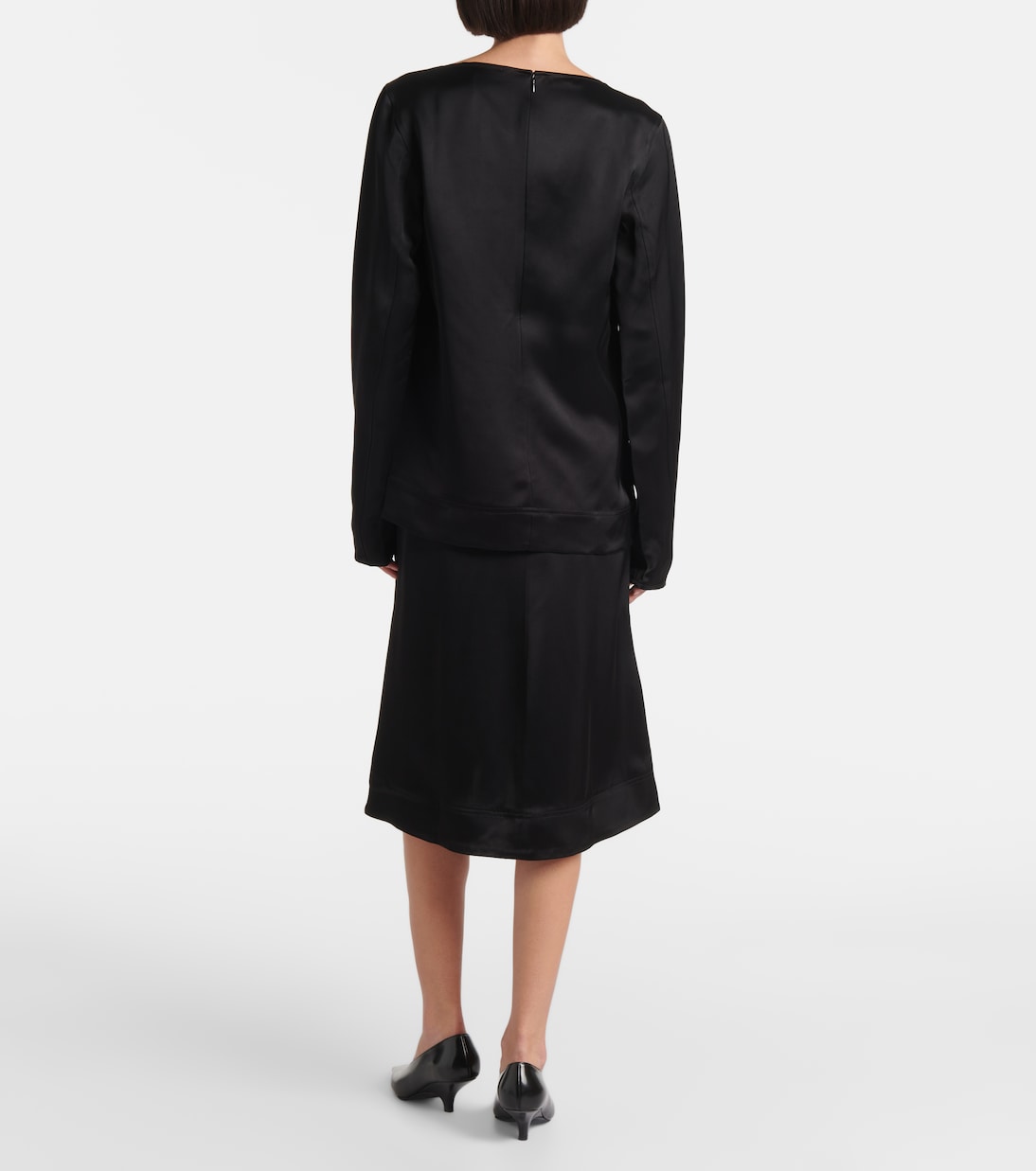 Toteme - ваш надежный партнер, если вам нужны минималистичные предметы гардероба, например, этот струящийся черный топ. Изящное и одновременно легкое, оно выполнено из блестящей атласной ткани с классическим вырезом лодочкой.