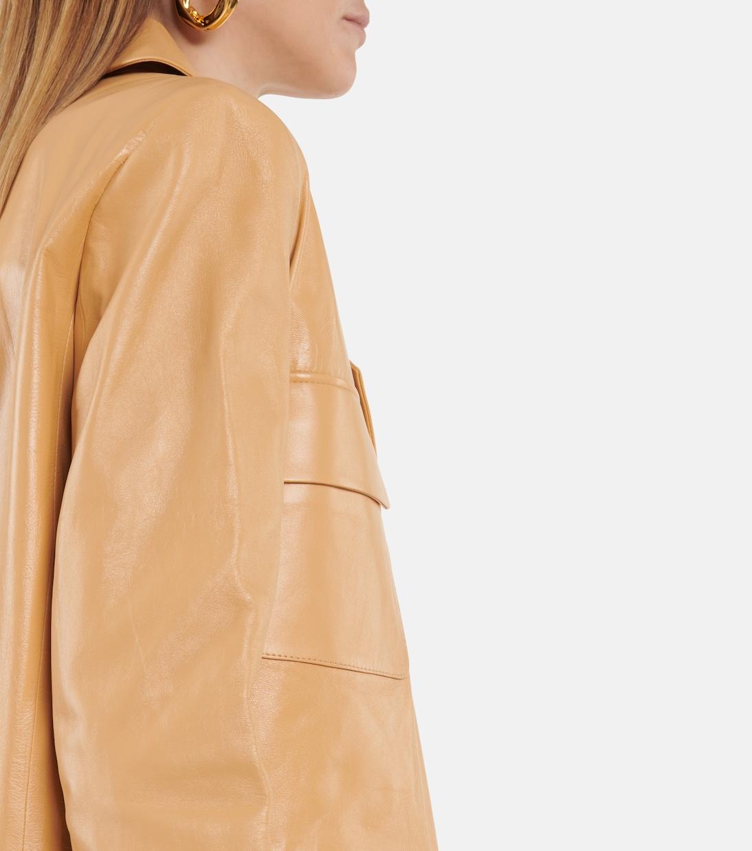 Zeynep Arçay привносит свой опыт в производство кожаных изделий, создавая этот блейзер из мягкой овчины в современном бежевом оттенке. Однобортный пиджак полностью на шелковой подкладке для идеальной драпировки. Он дополнен заостренными лацканами, низкой посадкой пуговиц и стандартной длиной.