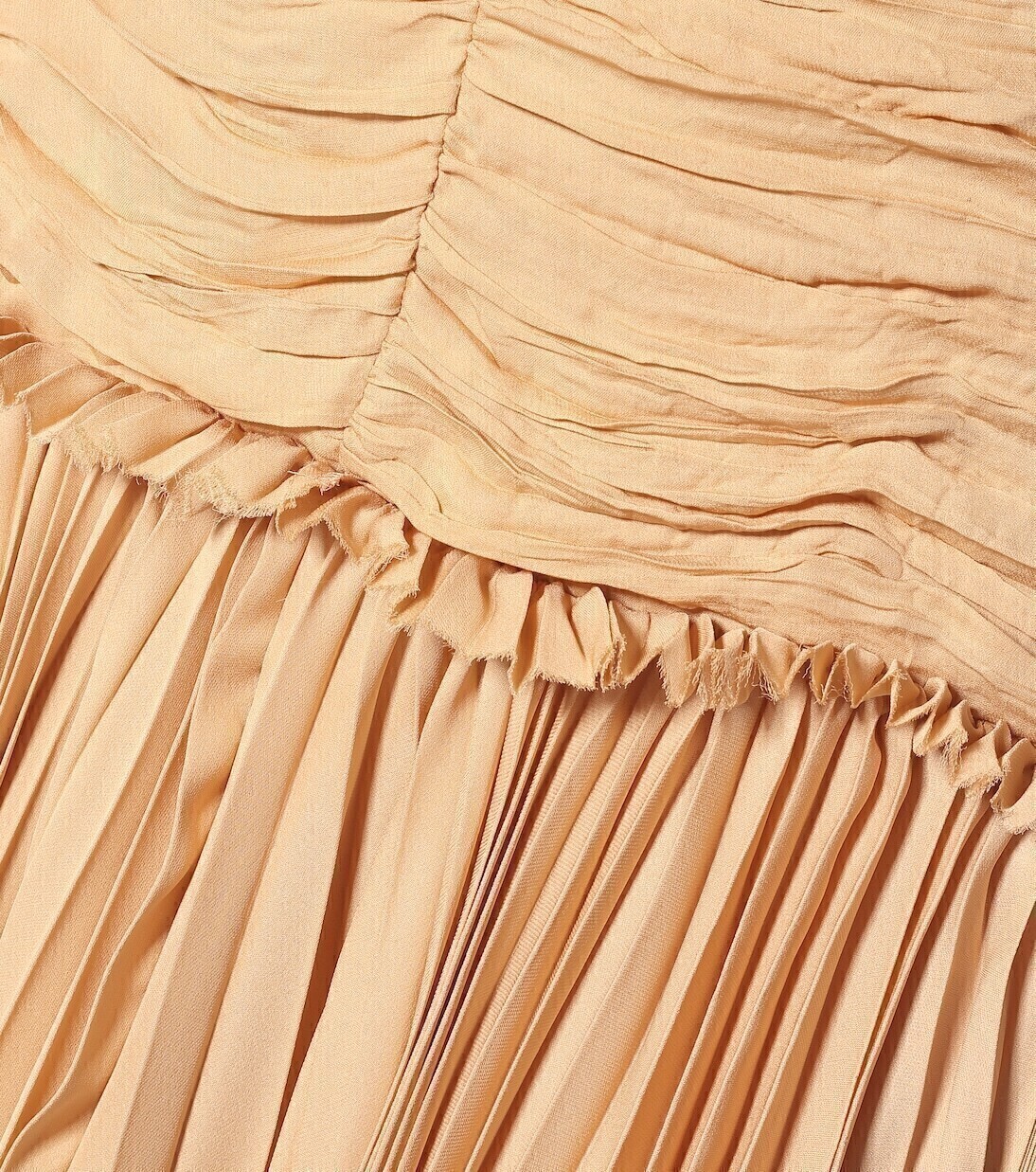 Бежевое платье миди Nanna от KHAITE, представляющее собой сочетание разных фактур, - просто бомба. Оно выполнено из шелкового жоржета и отличается лифом с лодочкой, присборенным по лифу, пышными плечами и плиссированной юбкой с необработанным краем. Сделайте свой образ центром внимания, дополнив его минималистичными аксессуарами.