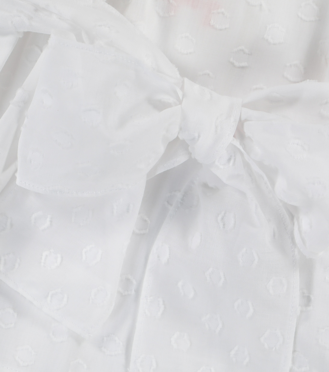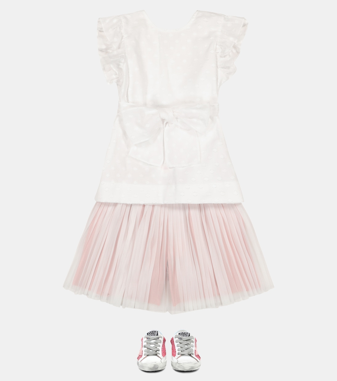 Белый топ, как в этом дизайне от Il Gufo, станет неотъемлемой частью ее летнего гардероба. Модель с оборчатыми рукавами-крылышками и талией на резинке станет очаровательным вариантом для пикников и барбекю. Благодаря хлопковому пошиву ее легко стирать, если появятся неизбежные пятна от травы.