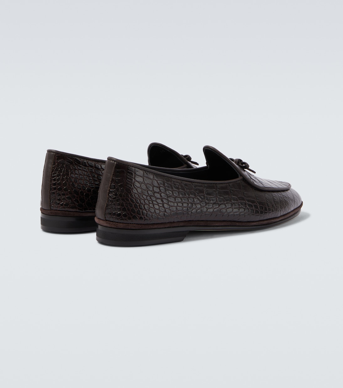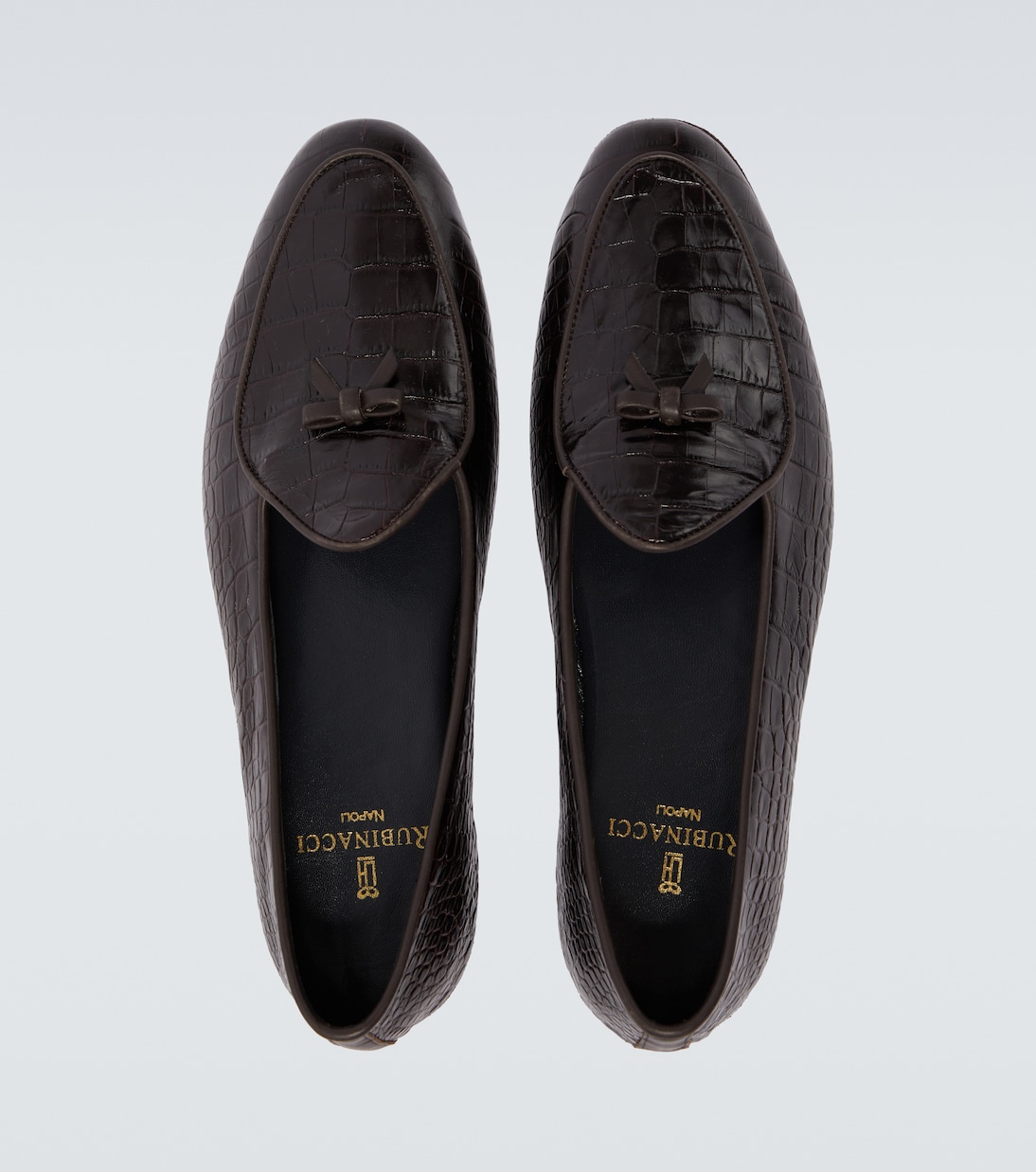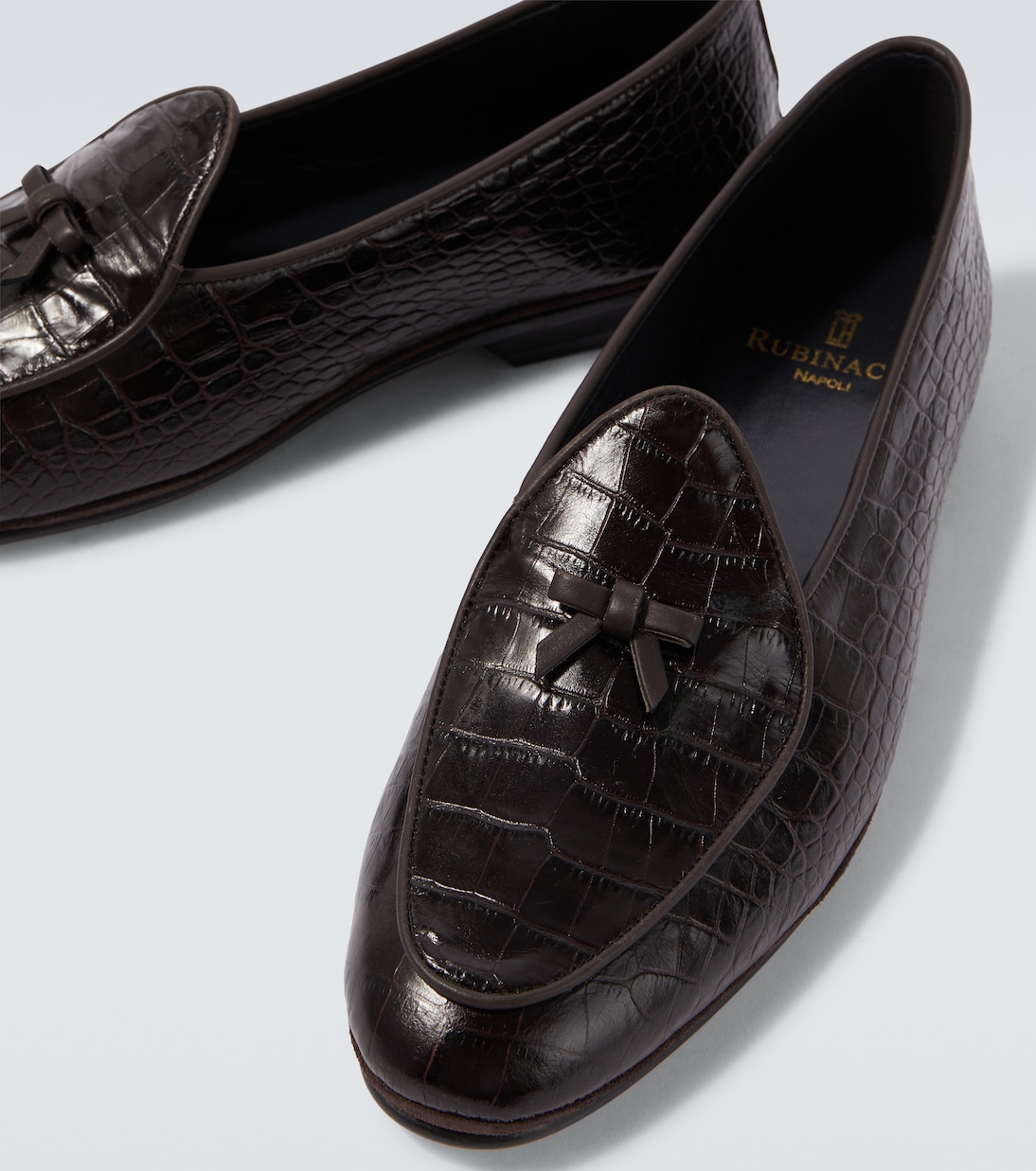 Благодаря семье Rubinacci, брендом управляет третье поколение законодателей моды, преданных индивидуальному пошиву и итальянскому ремеслу. Лоферы Marfy изготовлены из кожи с отделкой под крокодила.