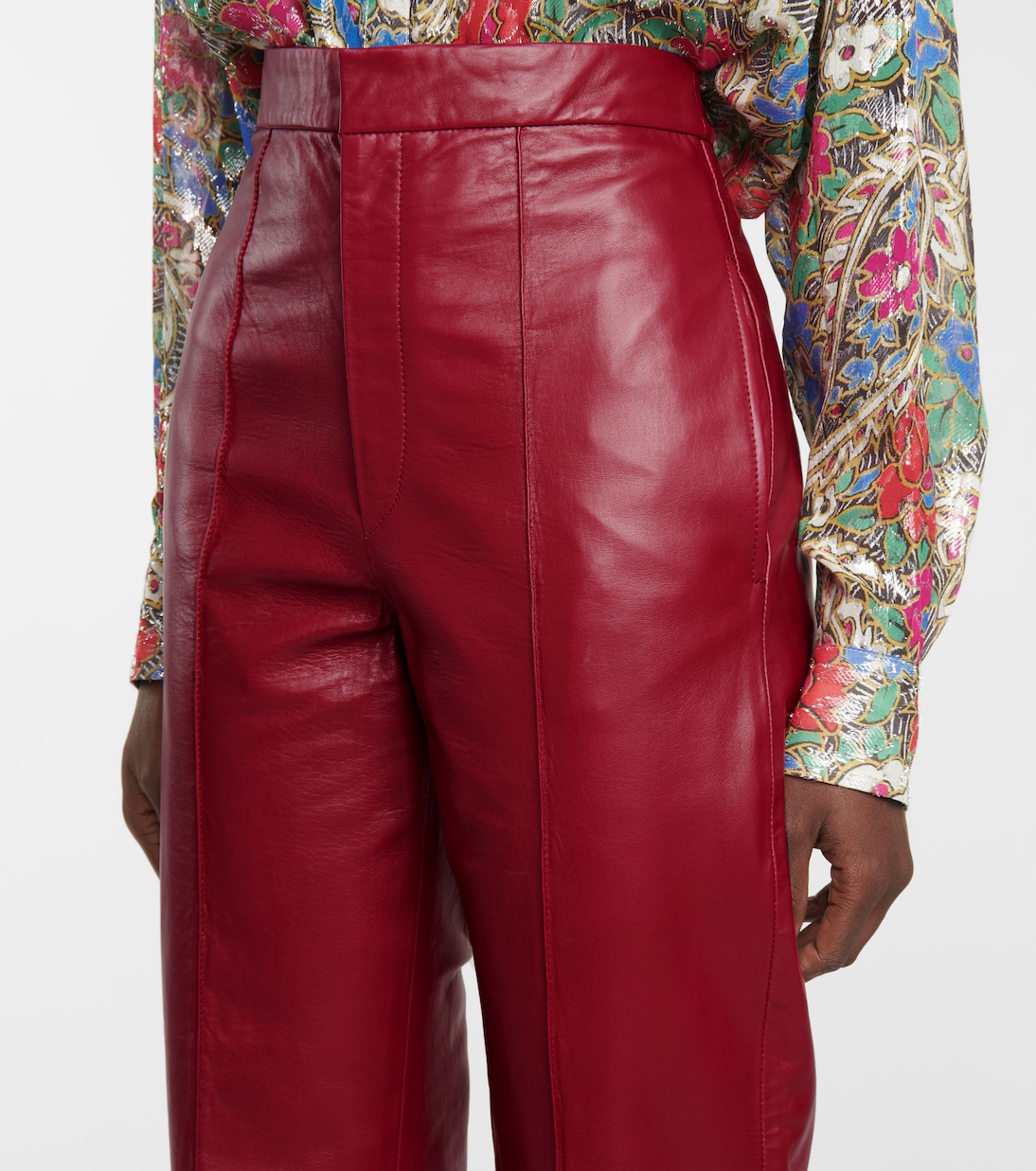 Брюки Bilirokia от Isabel Marant приятного малиново-красного оттенка изготовлены из кожи ягненка. Высокая талия, прямые брюки со складками.