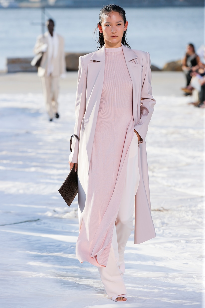 Брюки Peter Do имеют неровную строчку, проходящую по диагонали вдоль штанин. Это пара прямого кроя с высокой посадкой и острыми складками спереди.