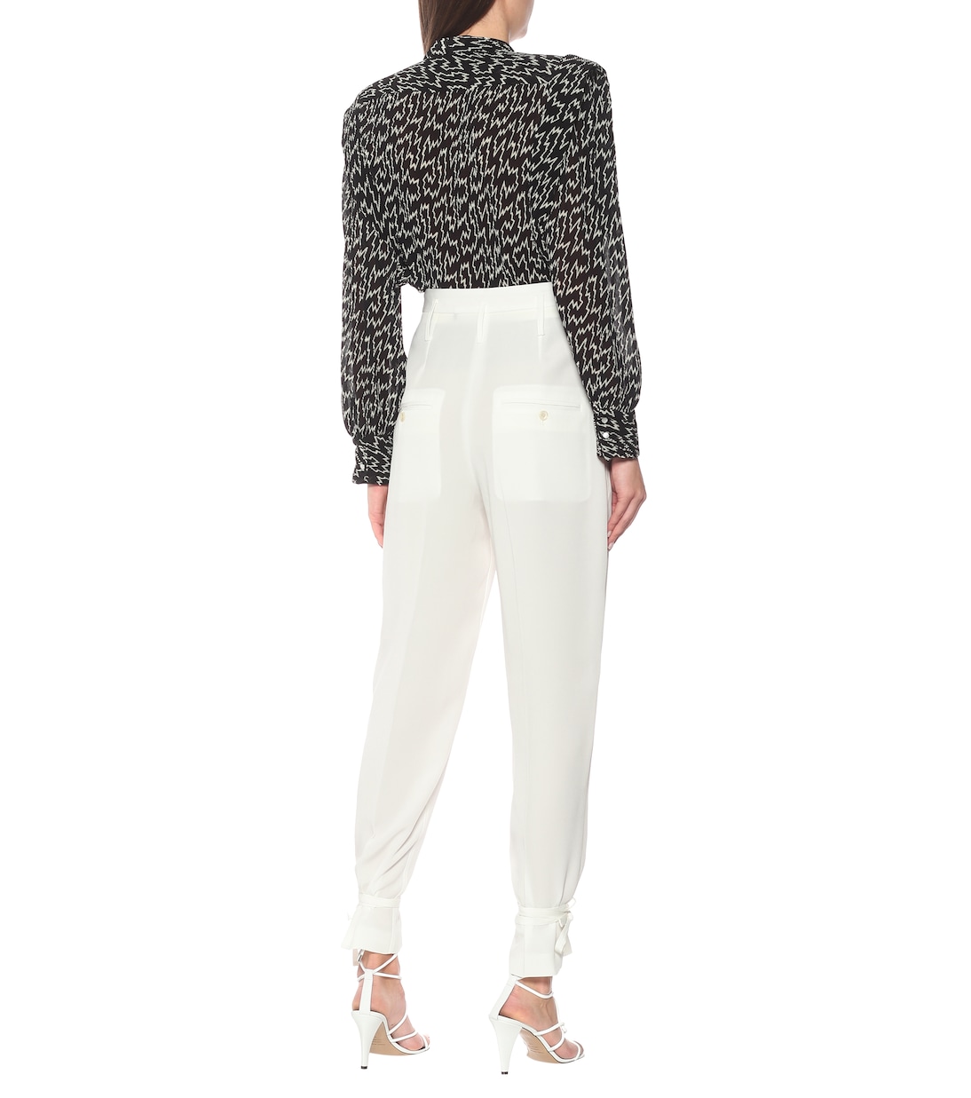 Брюки Racomi от Isabel Marant с высокой посадкой и силуэтом морковка отражают любовь бренда к зауженным силуэтам. Они сшиты из белого крепа с добавлением шелка, что в итоге дает полупрозрачный фасон, который прекрасно подходит для вечерних нарядов. Оберните завязки вокруг манжет, чтобы создать аутентичный уличный образ.