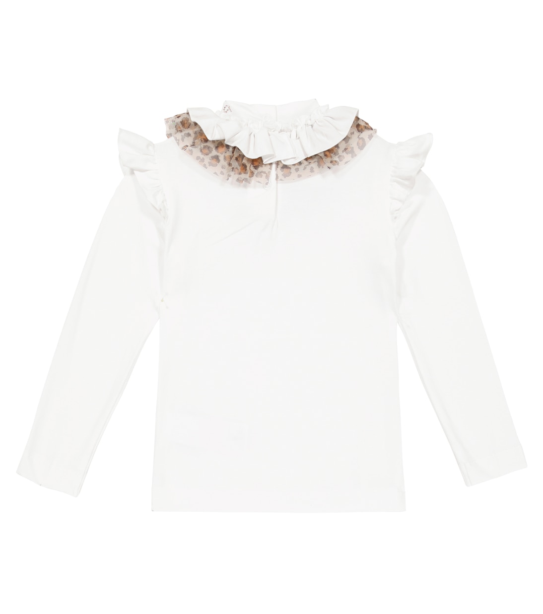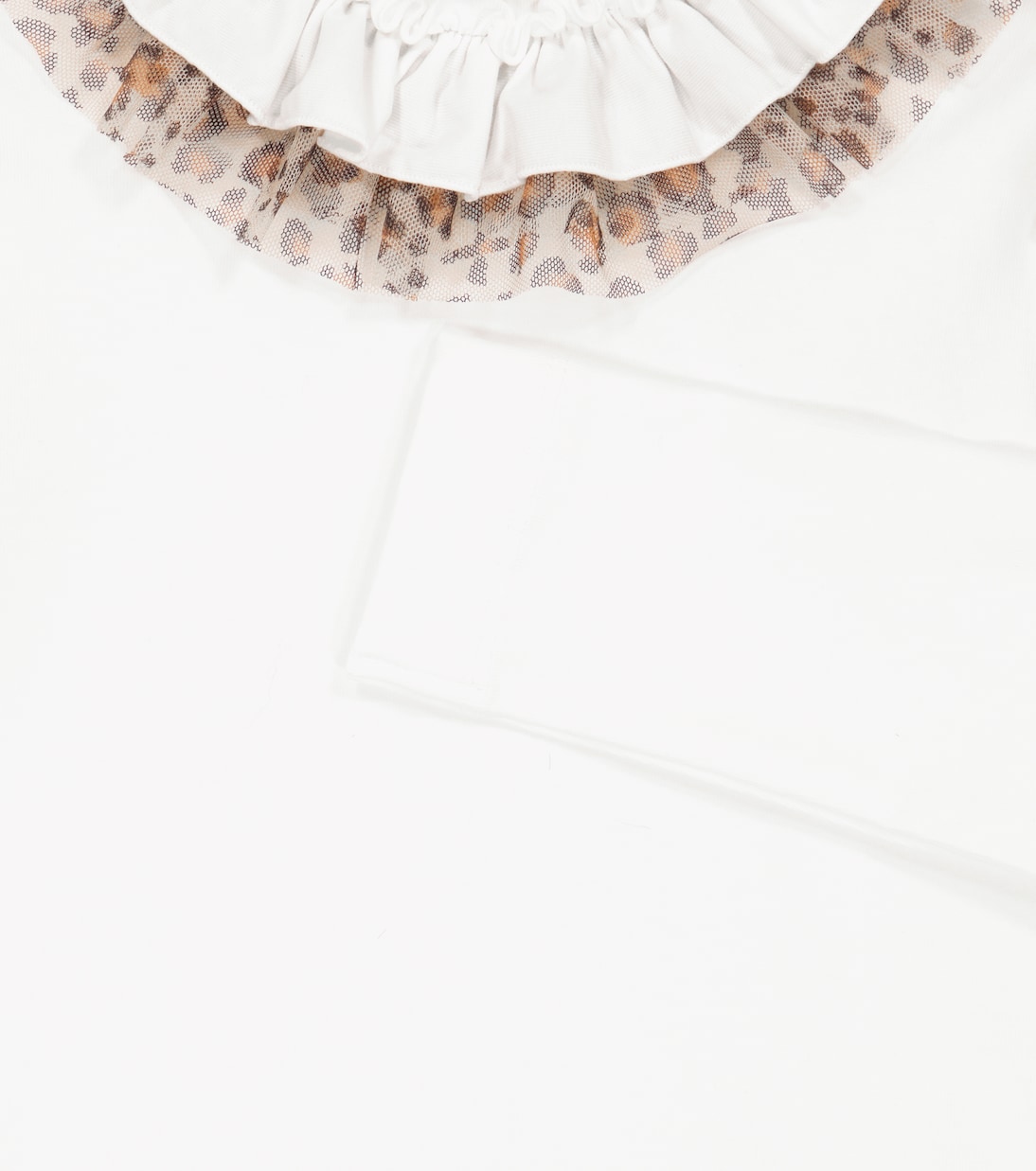 Будущие законодатели моды по достоинству оценят этот топ с оборкой от Monnalisa. Он сшит из комфортного хлопкового трикотажа с леопардовым принтом.