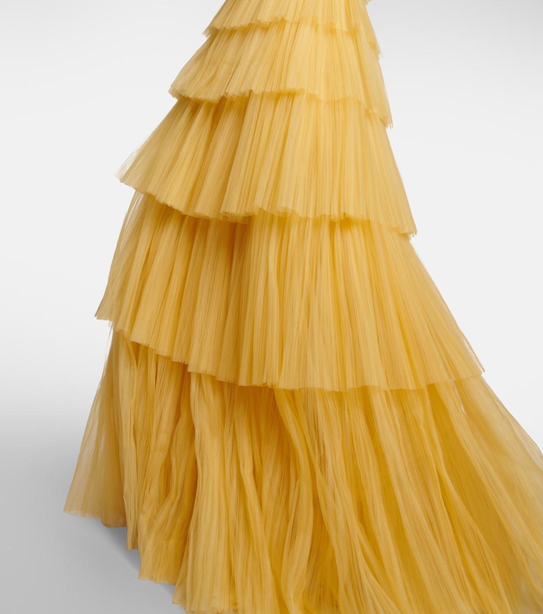 В этом очаровательном платье Costarellos вы будете излучать элегантность. Этот фатиновый дизайн, выполненный в сияющем солнечном оттенке, имеет многослойный лиф, приталенный пояс и ниспадающую юбку до пола с воланами.