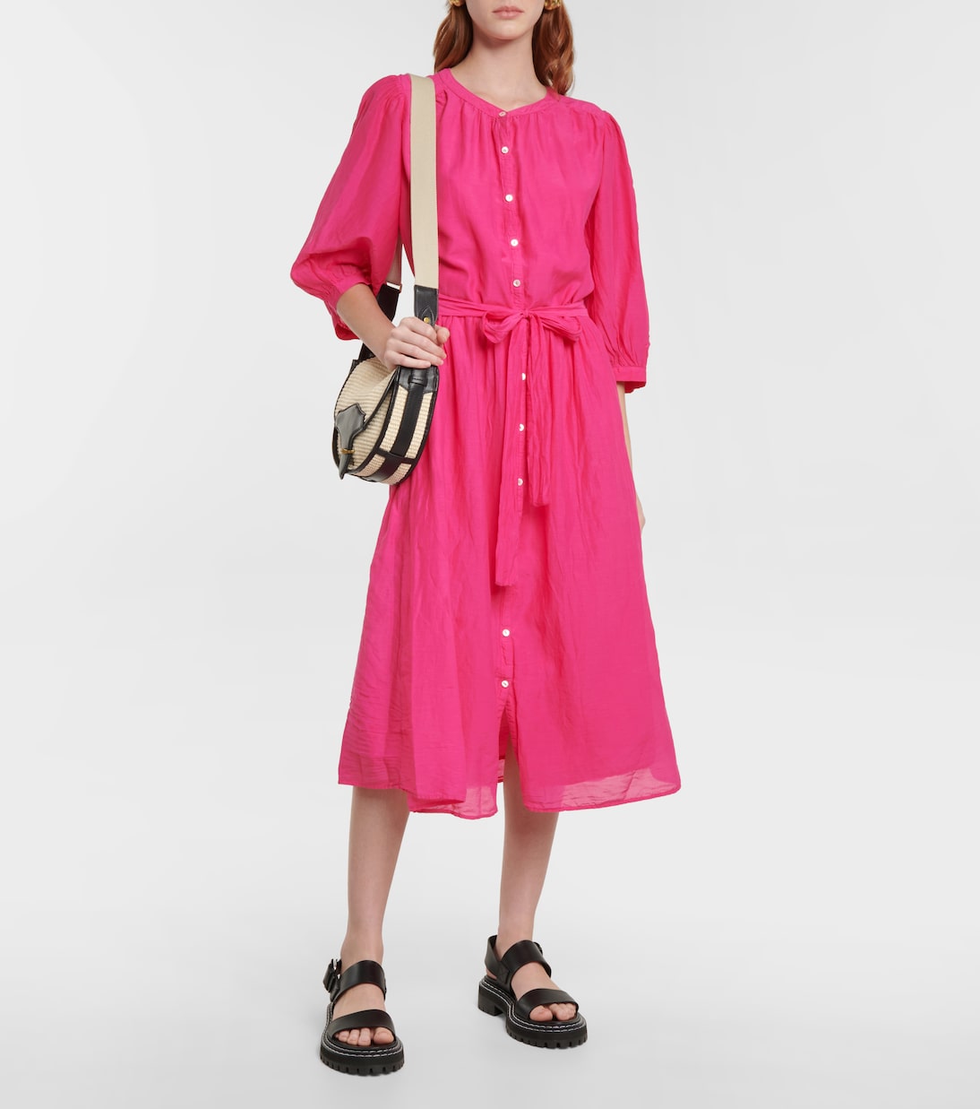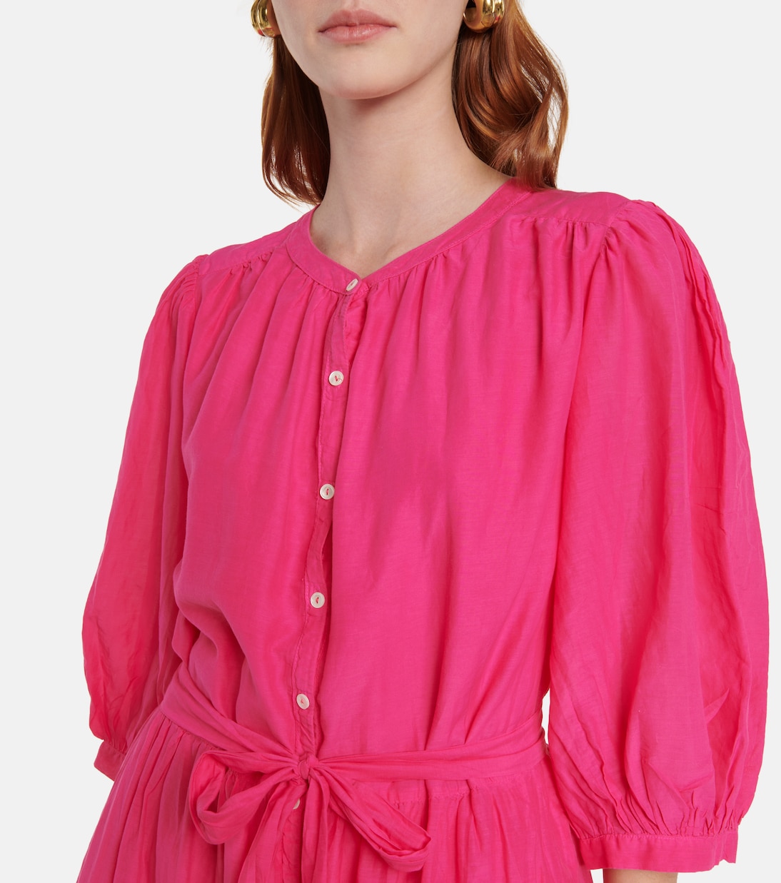 В этом сезоне розовый цвет стал фаворитом среди таких вещей, как миди-платье Emerson от Velvet. Стиль, вдохновленный блузкой, имеет объемные рукава, оборчатые манжеты, завязывающийся пояс и застежку на пуговицы спереди.