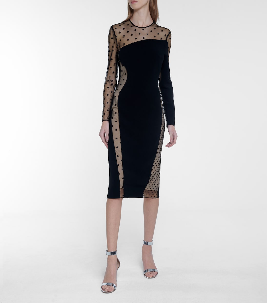 Веселый и кокетливый вошли в лексикон Стеллы Маккартни с платьем миди Arielle. Платье выполнено из черного кади, облегает фигуру, а чувственные сетчатые вставки украшены узором в горошек - игривый способ продемонстрировать немного тела. Независимо от того, собираетесь ли вы на прогулку или на вечеринку в одиночку, наденьте бархатные туфли-лодочки и черные колготки.