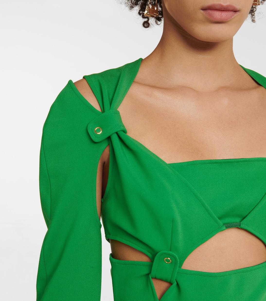 Видение лета от Jacquemus - красочное и веселое, как и мини-платье La Robe Mari. Изделие имеет разрезы с открытыми вырезами и застежкой на кнопки, а также пояс, который можно носить на одной ноге.