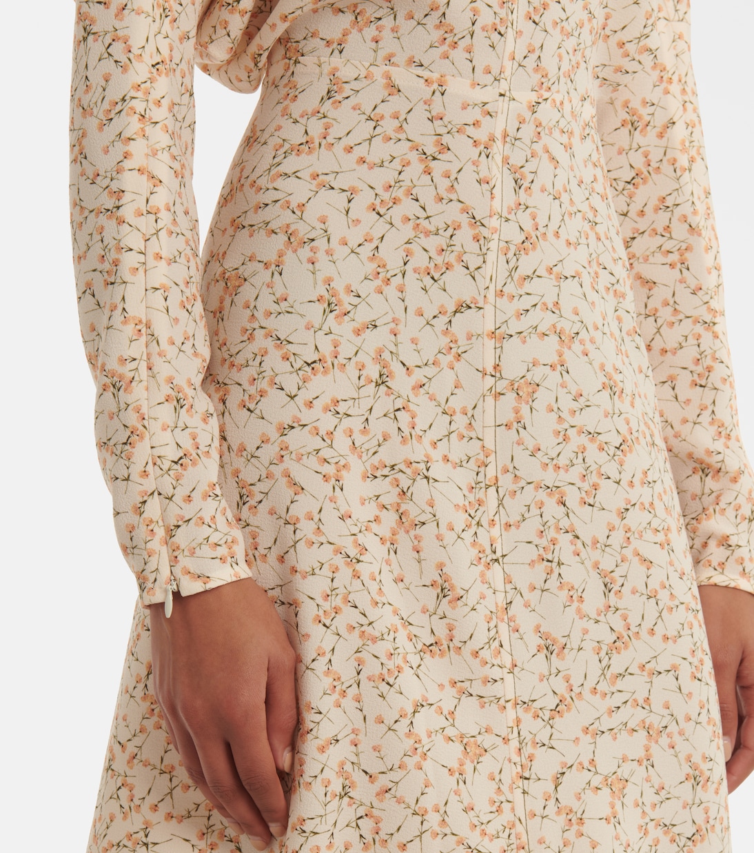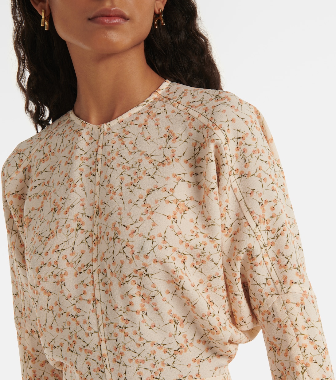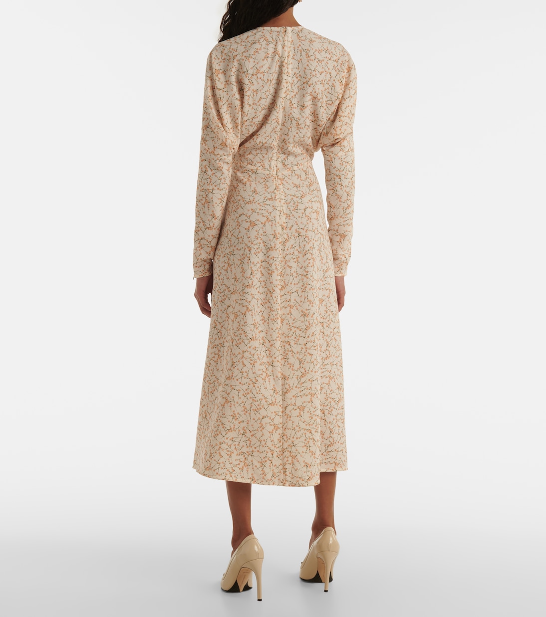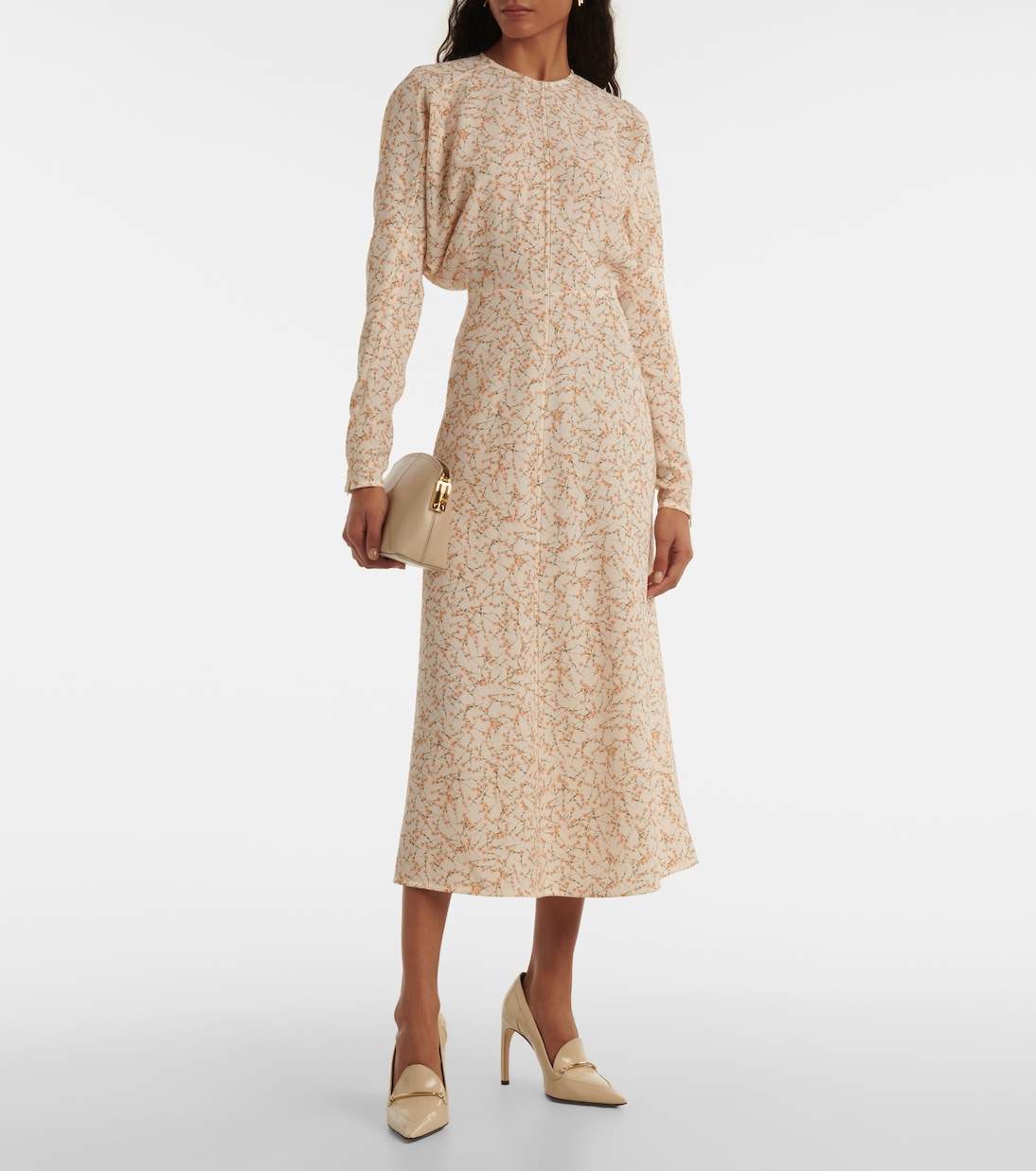 Виктория Бекхэм славится созданием вневременных силуэтов. Платье миди Долман с нежным цветочным принтом, приталенной талией, потайными молниями на запястьях и объемной драпировкой под мышками для эффектного образа.