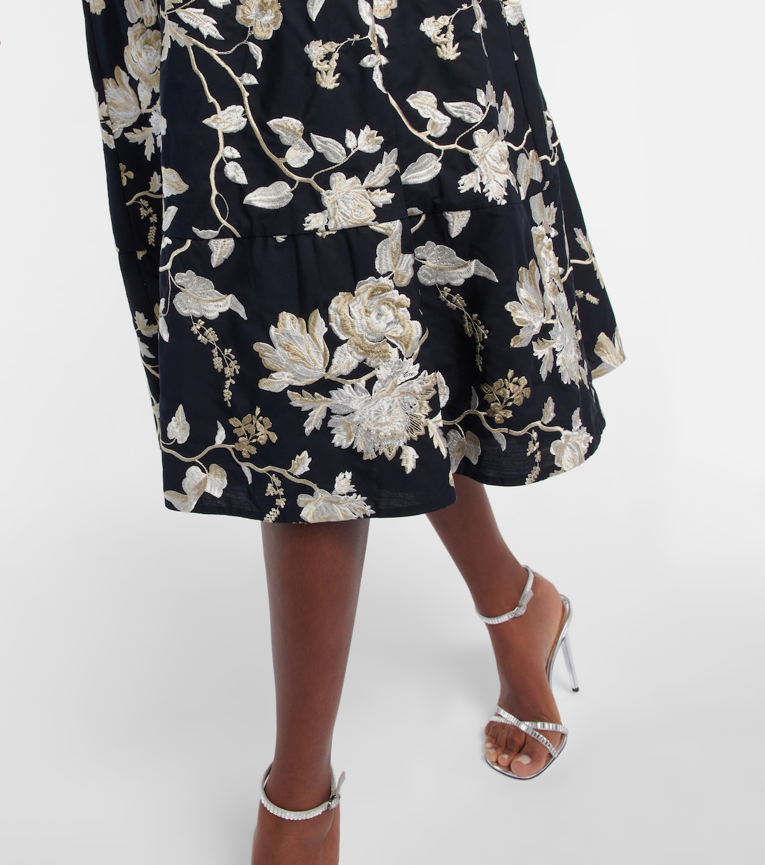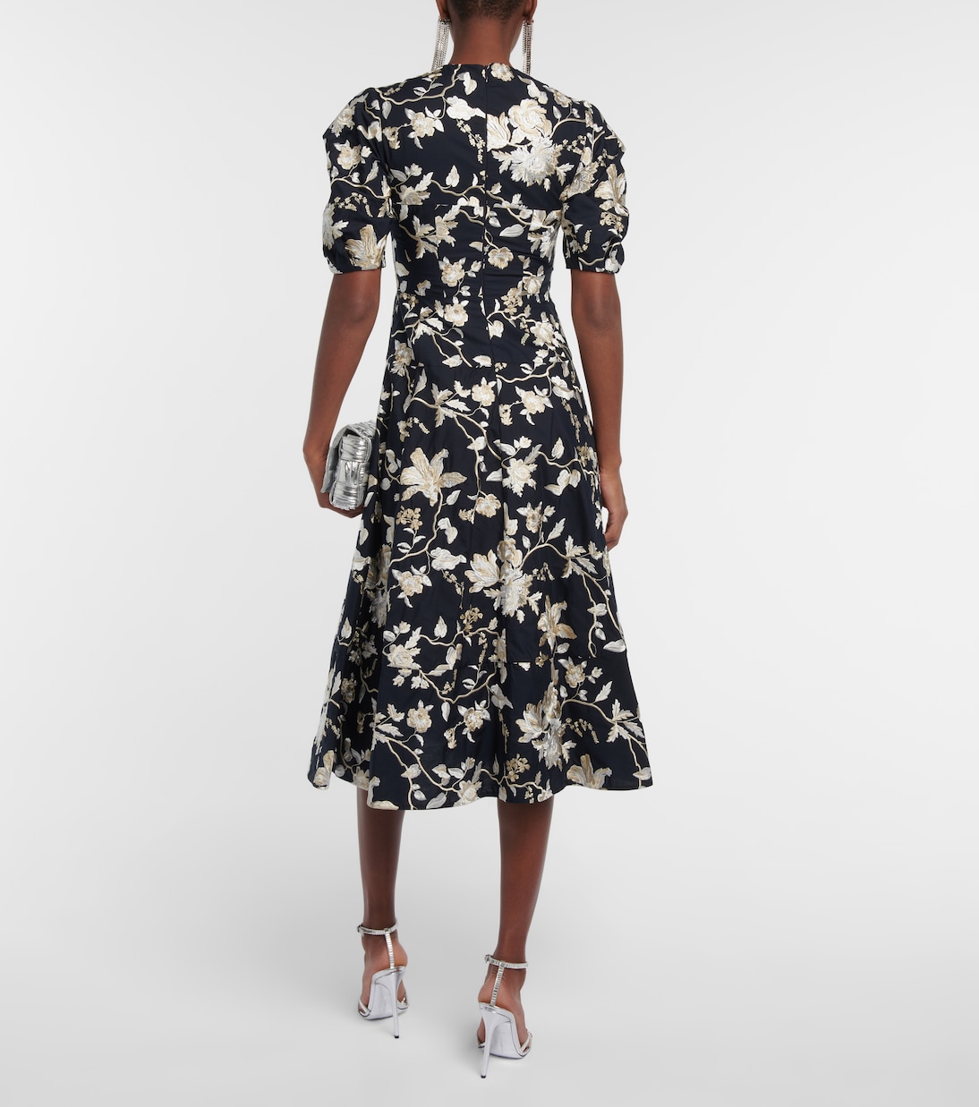 Воплотите женственную чувственность Erdem в элегантном миди-платье Kira. Изготовленный из темно-синего хлопкового смесового материала, фасон характеризуется рукавами-буфами, сложной цветочной вышивкой по всему изделию и объемной юбкой.