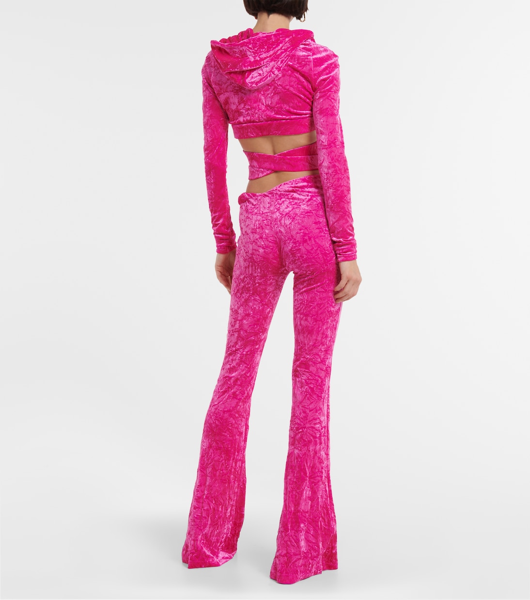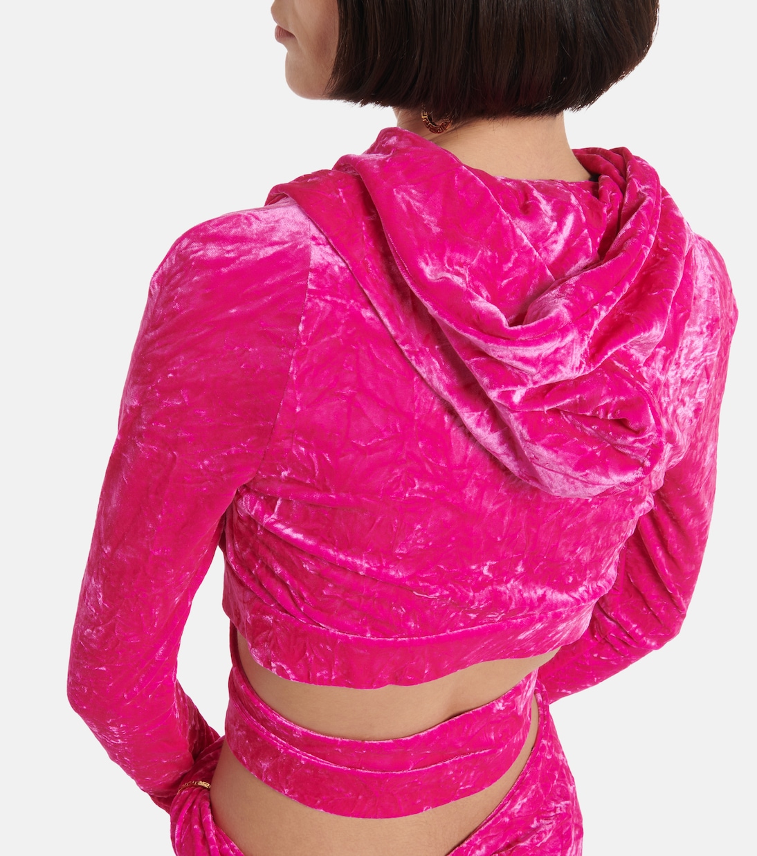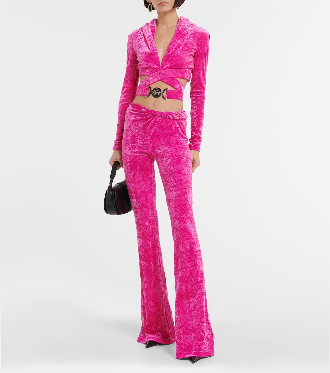 Воплощайте в жизнь фирменные коды Versace в этой укороченной толстовке с капюшоном от Versace. Изготовленный из плюшевого розового бархата, дизайн дополняется тисненым перекрещивающимся поясом с Медузой Бигги и глубоким вырезом.