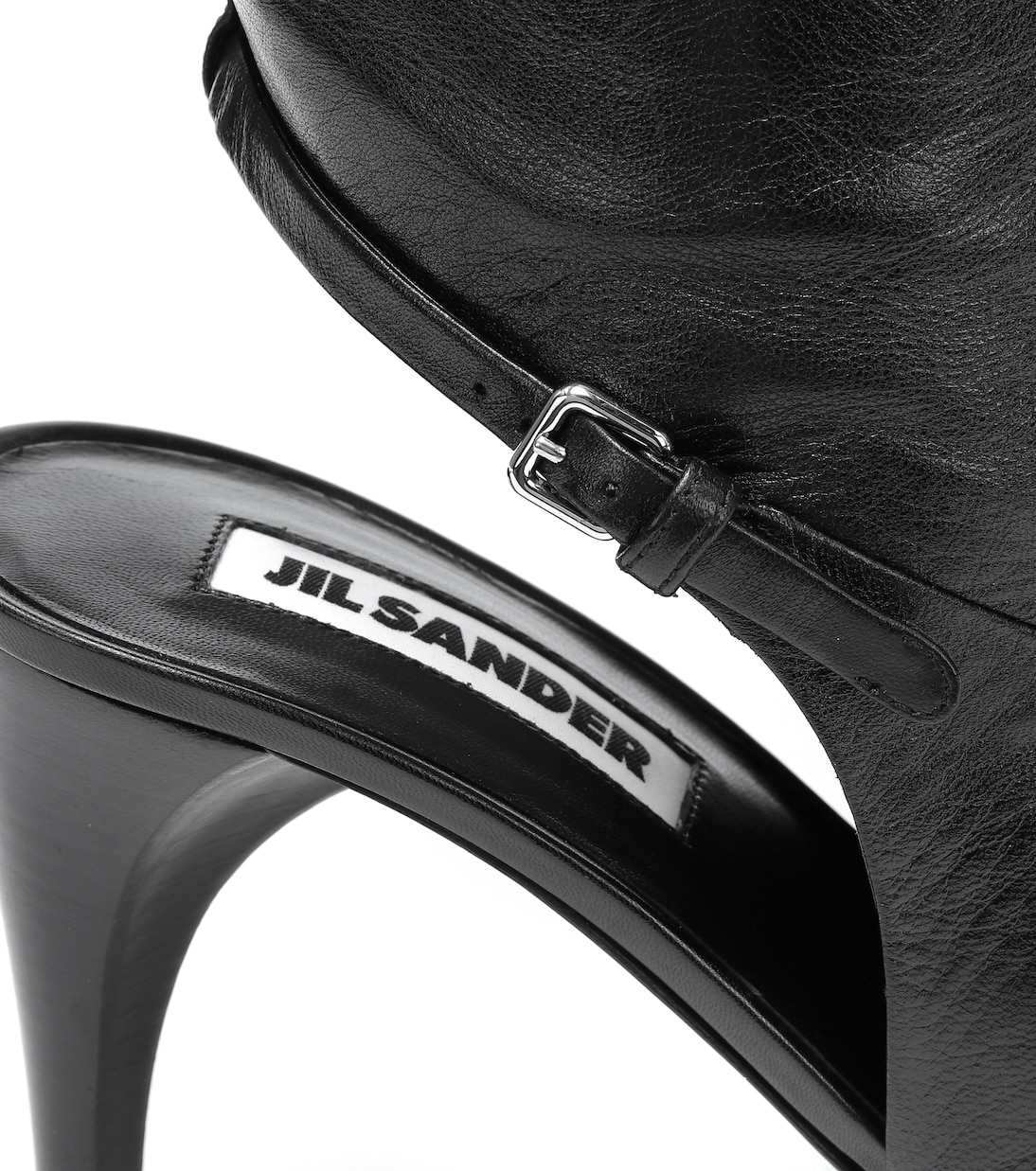 Вырезы на щиколотке - единственная уступка, позволяющая продемонстрировать кожу в этих высоких сапогах до колена от Jil Sander. Представленные на показе осень-зима 2020, они выполнены из фактурной черной кожи и дополнены каблуком-шпилькой высотой 95 мм. Балансируя между минималистской чувственностью бренда и передовой модой, подчеркните дизайн с помощью подола миди.