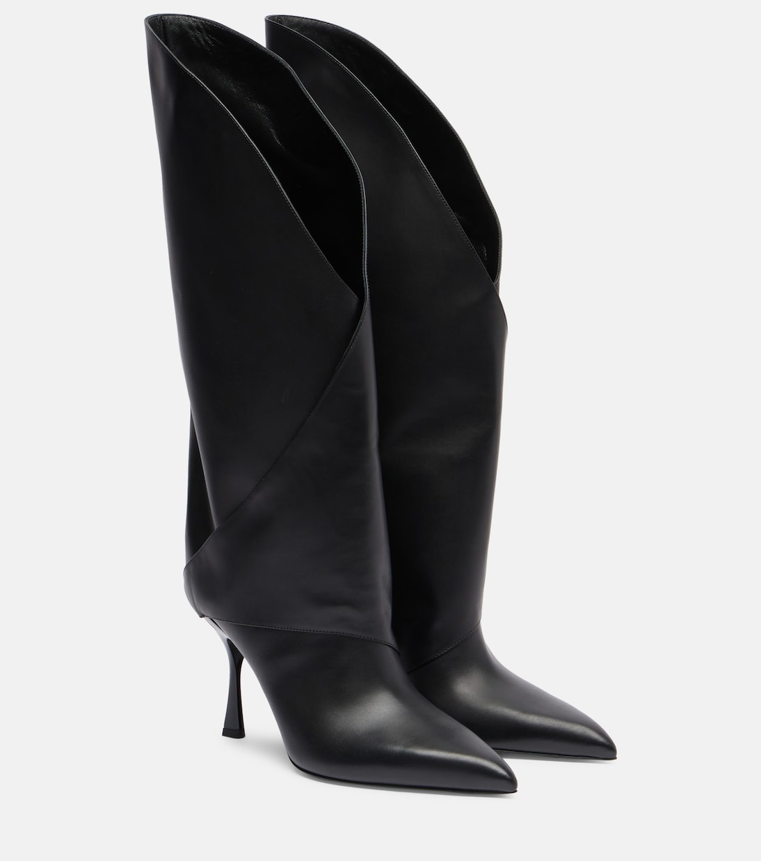 Высокие сапоги Twist от Balmain имеют сложенный верх в стиле гетр и скульптурный каблук высотой 95 мм с вырезом, создающим смелый образ. Эта пара с острым носком украшена золотистым логотипом PB бренда.