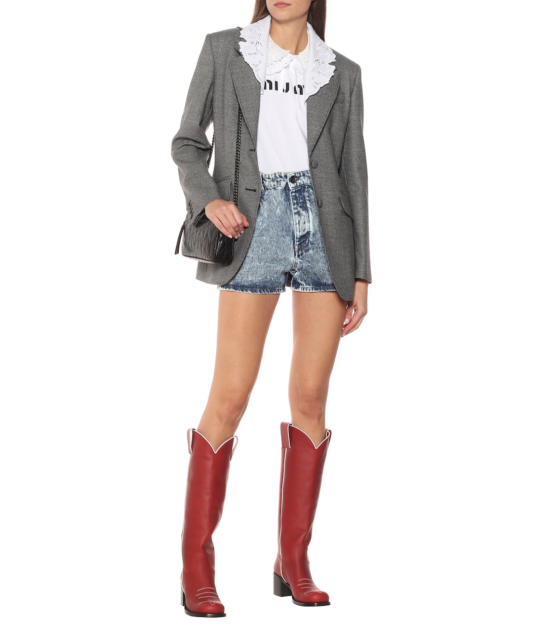 Даже самые сдержанные в выборе цвета обувные сапоги Pillar Box от Miu Miu придутся по вкусу. Они изготовлены из телячьей кожи и украшены белой окантовкой и вышивкой на союзке. Наши редакторы предлагают сочетать их с платьями-футлярами этого бренда.