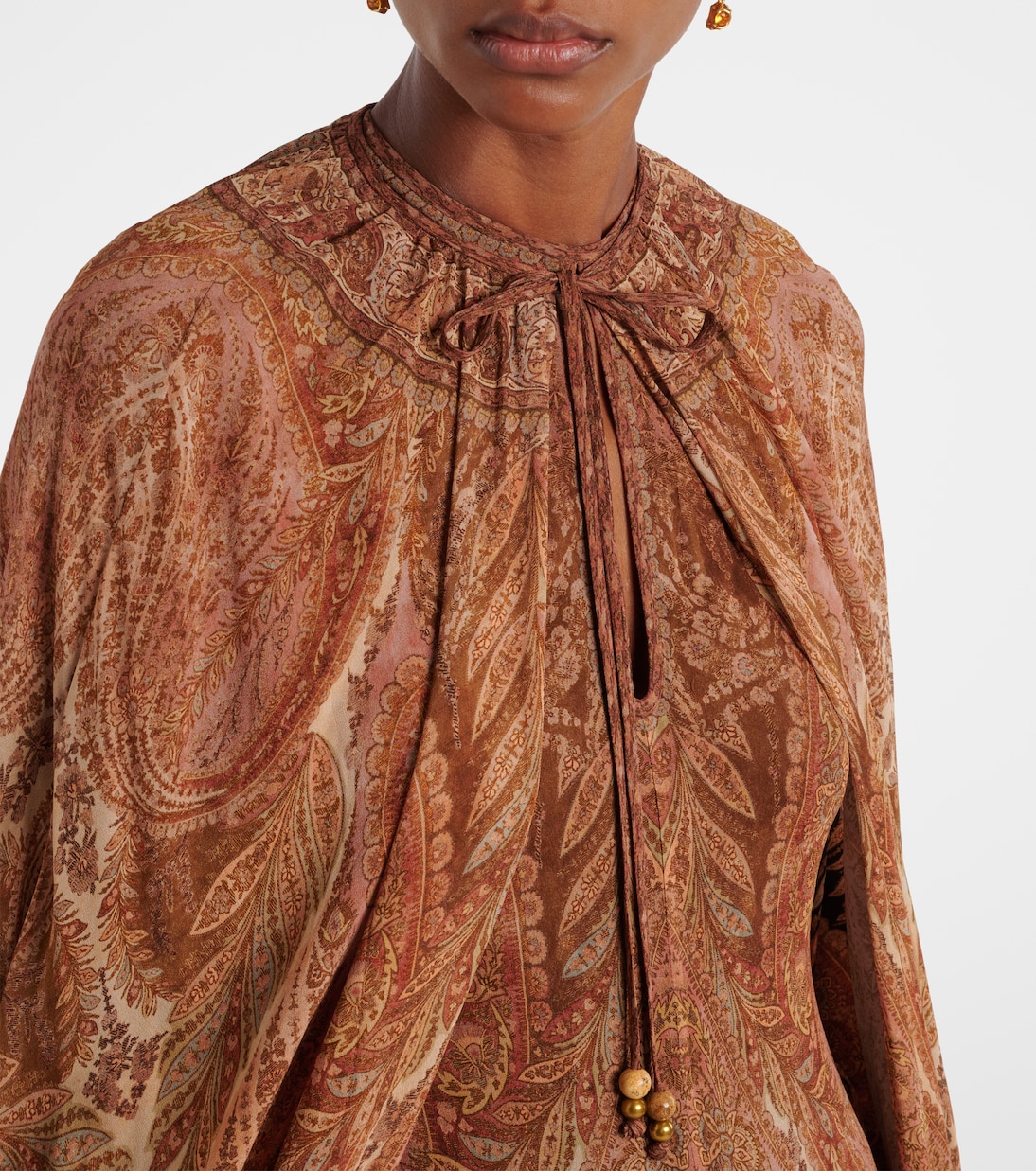 Длинное платье-макси Hypnotic от Zimmermann отличается вырезом-замочной скважиной с завязками, манжетами на пуговицах и струящейся накидкой, застегивающейся на шее, что придает образу изысканности. Этот дизайн украшен ярким принтом пейсли.
