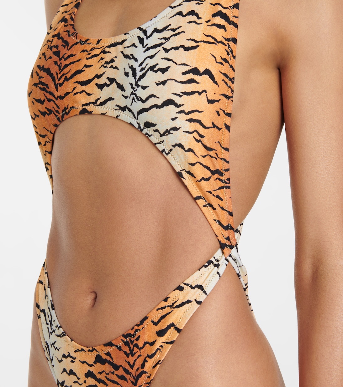 Для смелого образа у бассейна выберите оранжево-белый купальник Marina от Reina Olga. Модель с глубоким круглым вырезом, ярким тигровым принтом, эффектными вырезами и облегающим бразильским кроем брючин. Изготовленный вручную в Италии, этот эластичный трикотажный фасон станет основой вашего гардероба для отдыха.