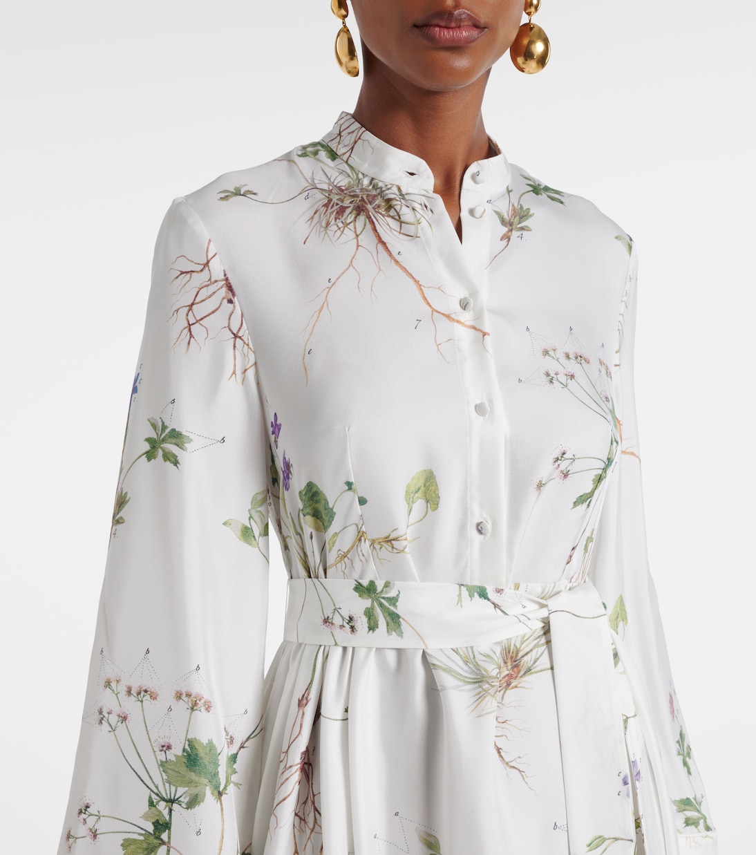 Добавьте в свой гардероб нотку современной романтики с помощью причудливых и изящных дизайнов Erdem. Это шелковое платье миди украшено нежным цветочным принтом, длинными рукавами и застежкой на пуговицы спереди для легкого, женственного образа с классической структурой.