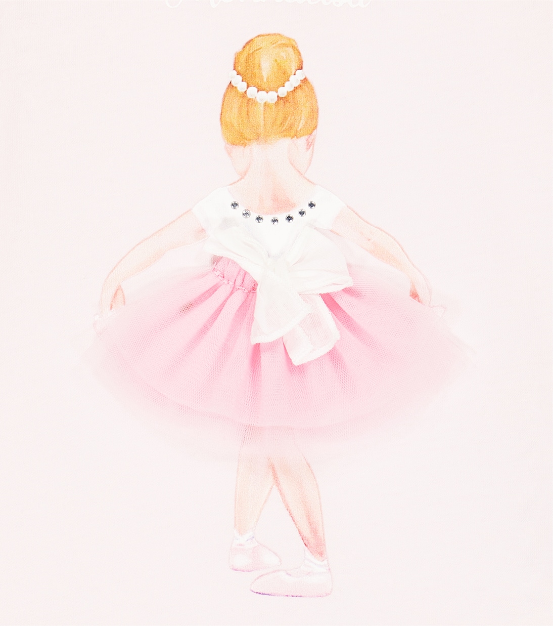 Добавьте немного изюминку в гардероб вашей маленькой модницы с этим топом от Monnalisa. Модель с длинными рукавами, выполненная из мягкого хлопкового трикотажа, имеет свободный крой и очаровательный принт с балериной и отделкой из тюля.
