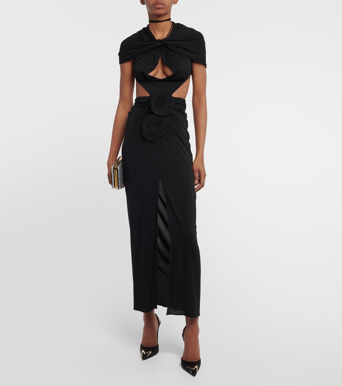 Доверьтесь Магде Бутрым, и она привнесет уникальность и современность в ваш монтаж. Это платье миди с капюшоном имеет извилистый силуэт, определяемый вырезом-замочной скважиной и вырезами на талии, украшенными розой.