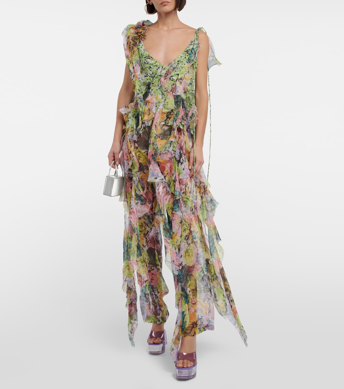 Дополните свой праздничный образ высокими мюлями Dalida Glass от Amina Muaddi. Сделано в Италии из сиреневого ПВХ, они установлены на фирменном расклешенном каблуке бренда.