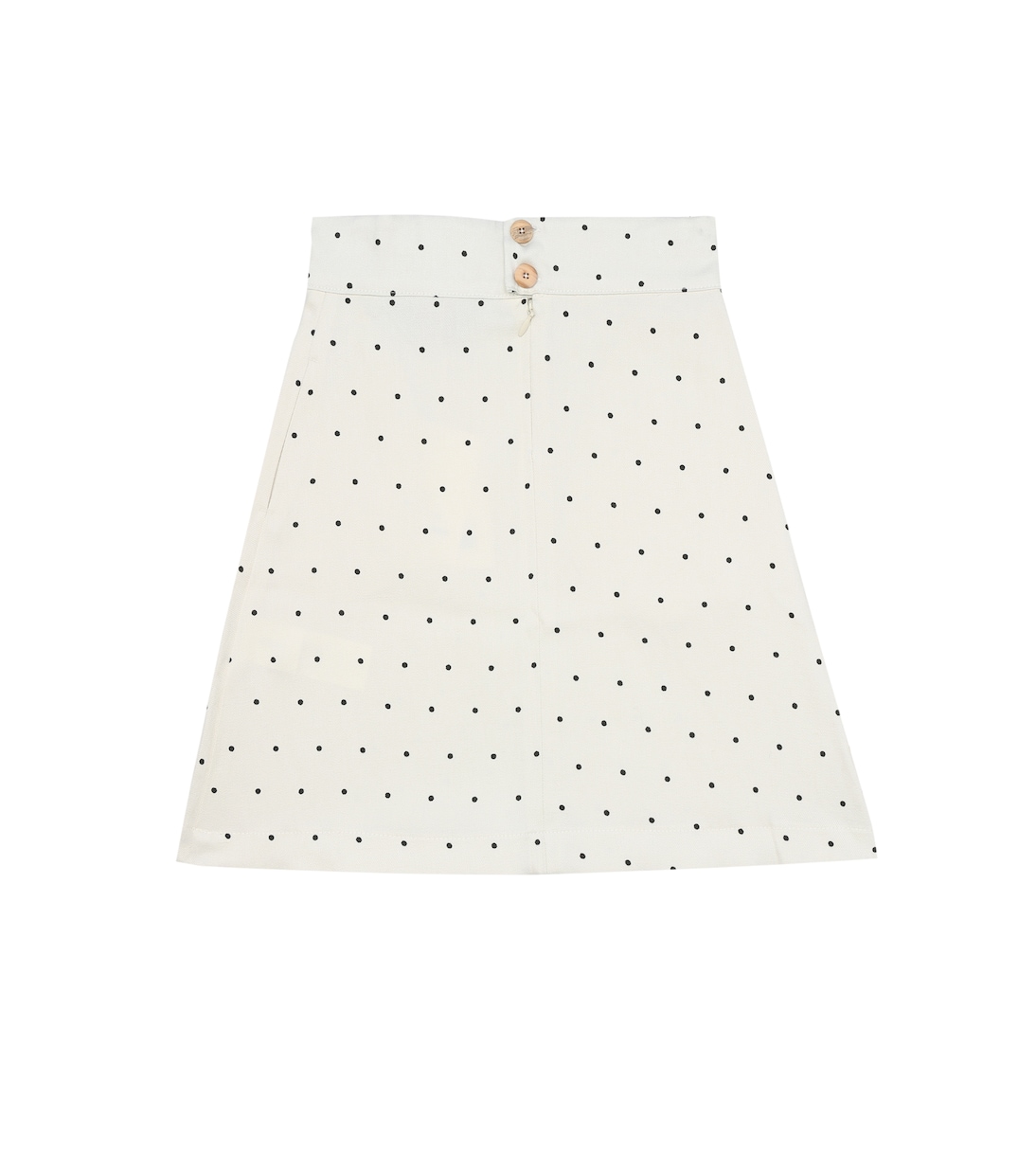 Ее любимый горошек украшает эту однотонную юбку Swan от The Animals Observatory. Изготовлено из смеси льна в саржевом переплетении с добавлением эластичности для комфорта, имеет А-образный силуэт и вышитый брендинг.