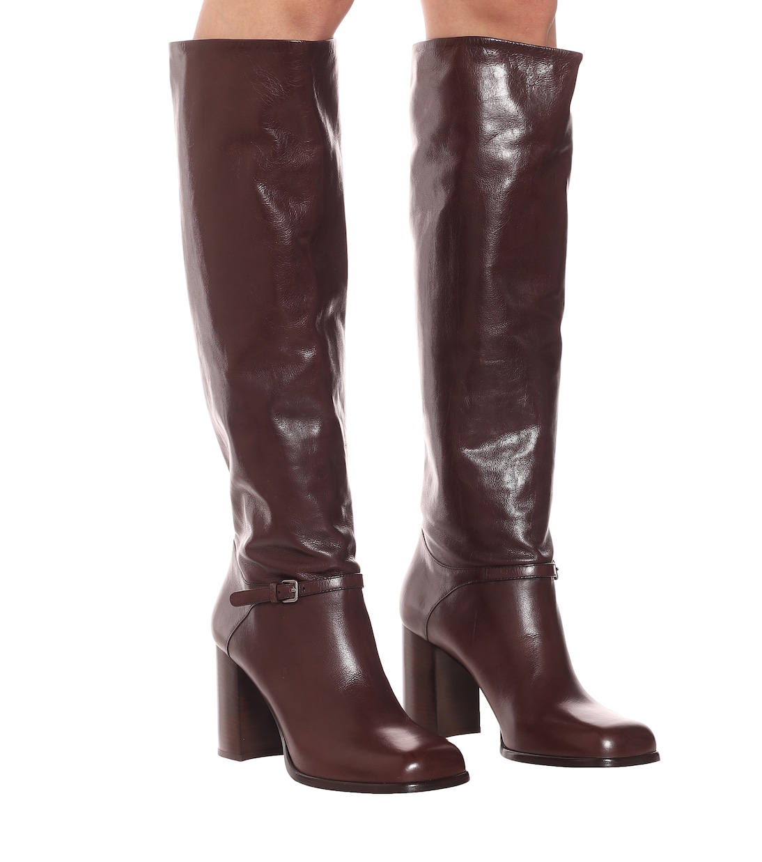 Если вы хотите носить эту обувь и днем, и ночью, выберите эти коричневые кожаные сапоги до колена от Miu Miu. Классический силуэт с пряжками на щиколотках, квадратным носком и блочным каблуком. Носите их с коротким подолом, чтобы они были полностью видны.