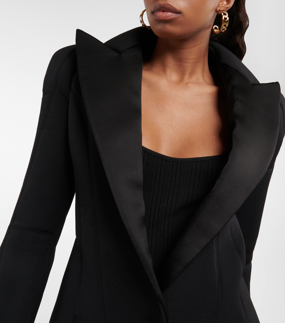 Если вы хотите создать необычный образ мини-платья, выберите эту черную шерстяную модель от Balmain. Выполнен в стиле строгого блейзера с объемными лацканами и рельефными пуговицами.