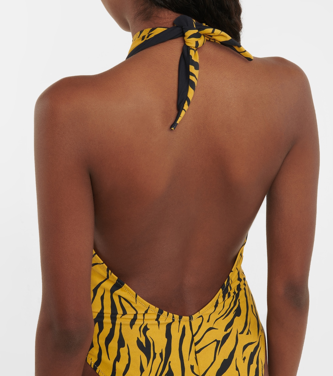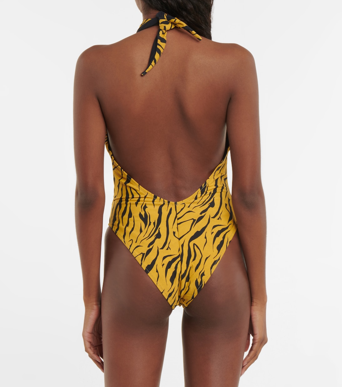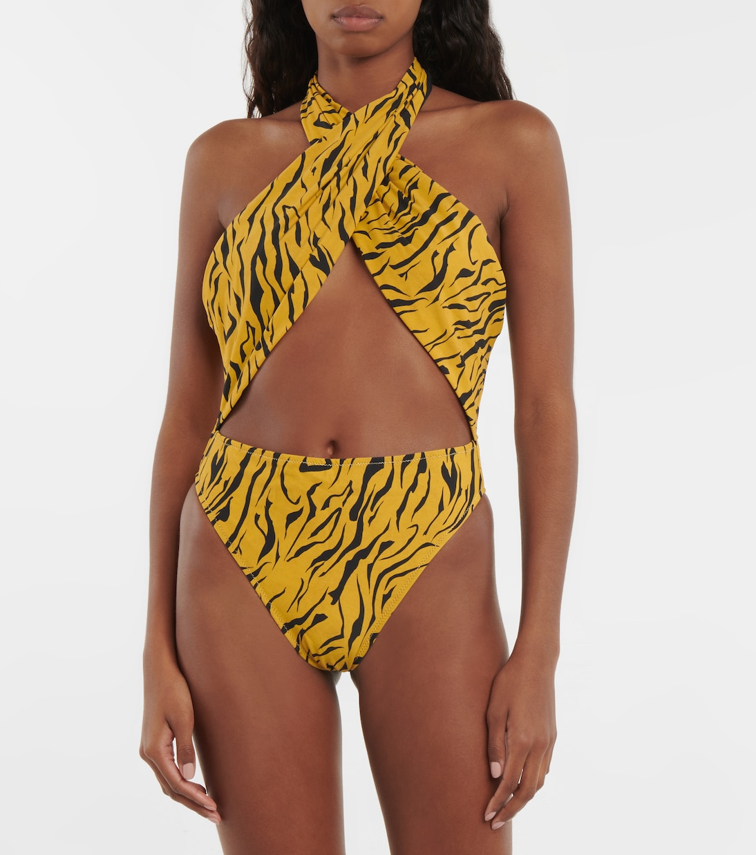 Если вы хотите создать смелый образ у бассейна, выберите купальник Italian Stallion от Reina Olga. Этот слитный купальник с тигровым принтом, изготовленный из высокоэластичной ткани для плавания, имеет перекрещивающуюся халтер-бретельку, вырезы и подчеркивающий фигуру высокий вырез, обеспечивающий минимальную застежку.