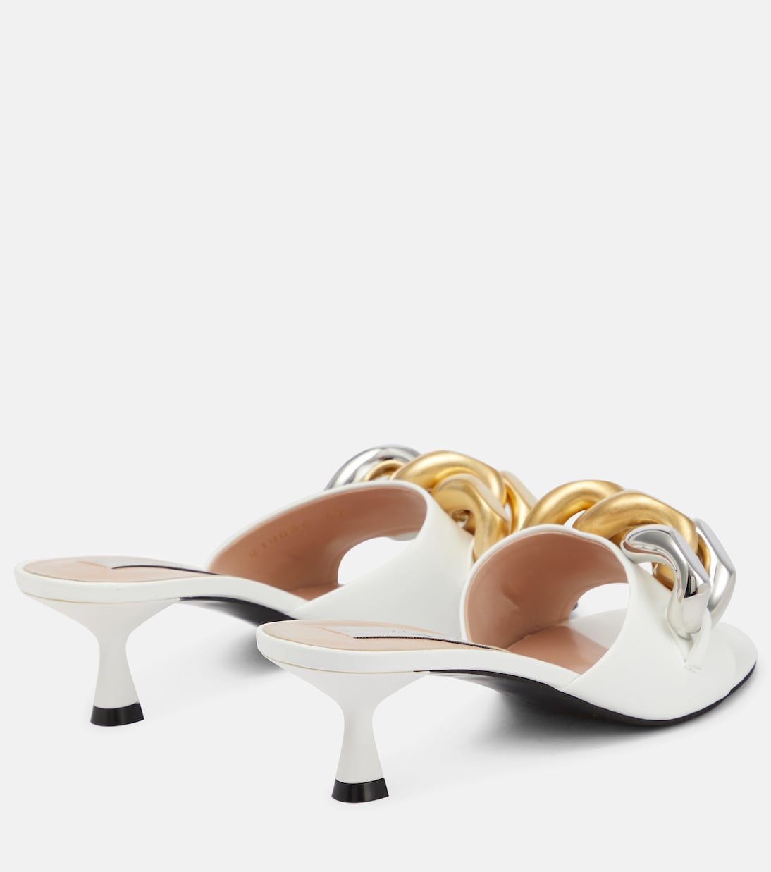 Завершите эффектный образ с мюлями Falabella от Stella McCartney. Они выполнены из полированной белой искусственной кожи с фурнитурой в виде звеньев цепи с алмазной огранкой и расклешенным каблуком-рюмочкой.