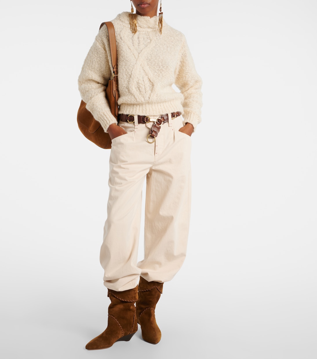 Замшевые сапоги Edoa от Isabel Marant привнесут в ваш образ нотку вестерн-эстетики. Высота каблука 45 мм, заостренный носок и отложной верх с плетеными кожаными деталями.