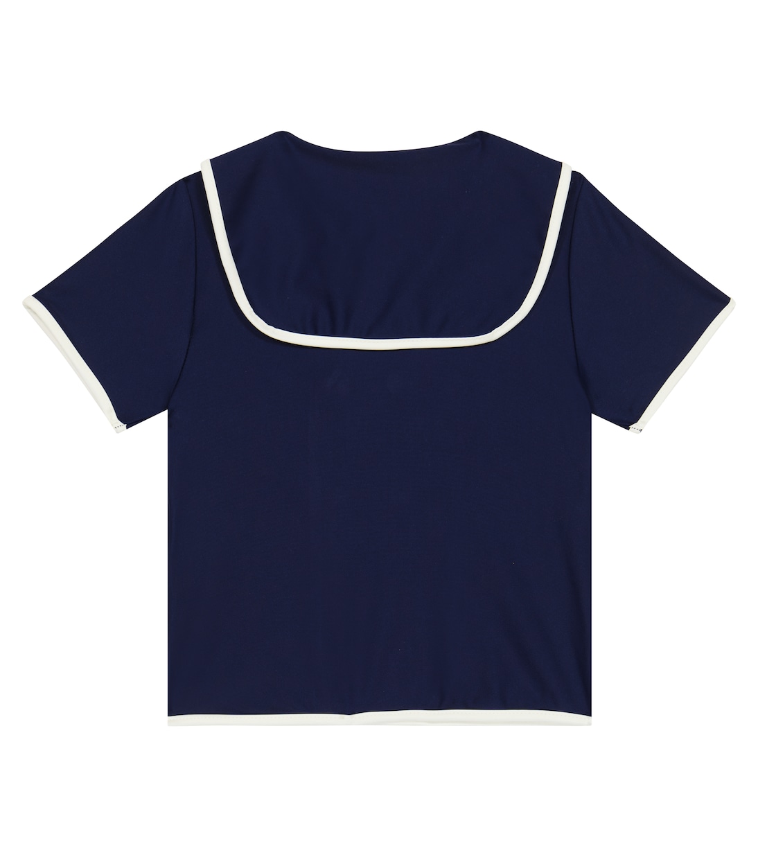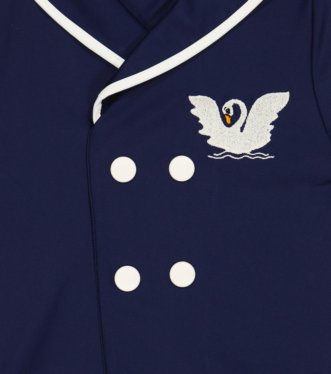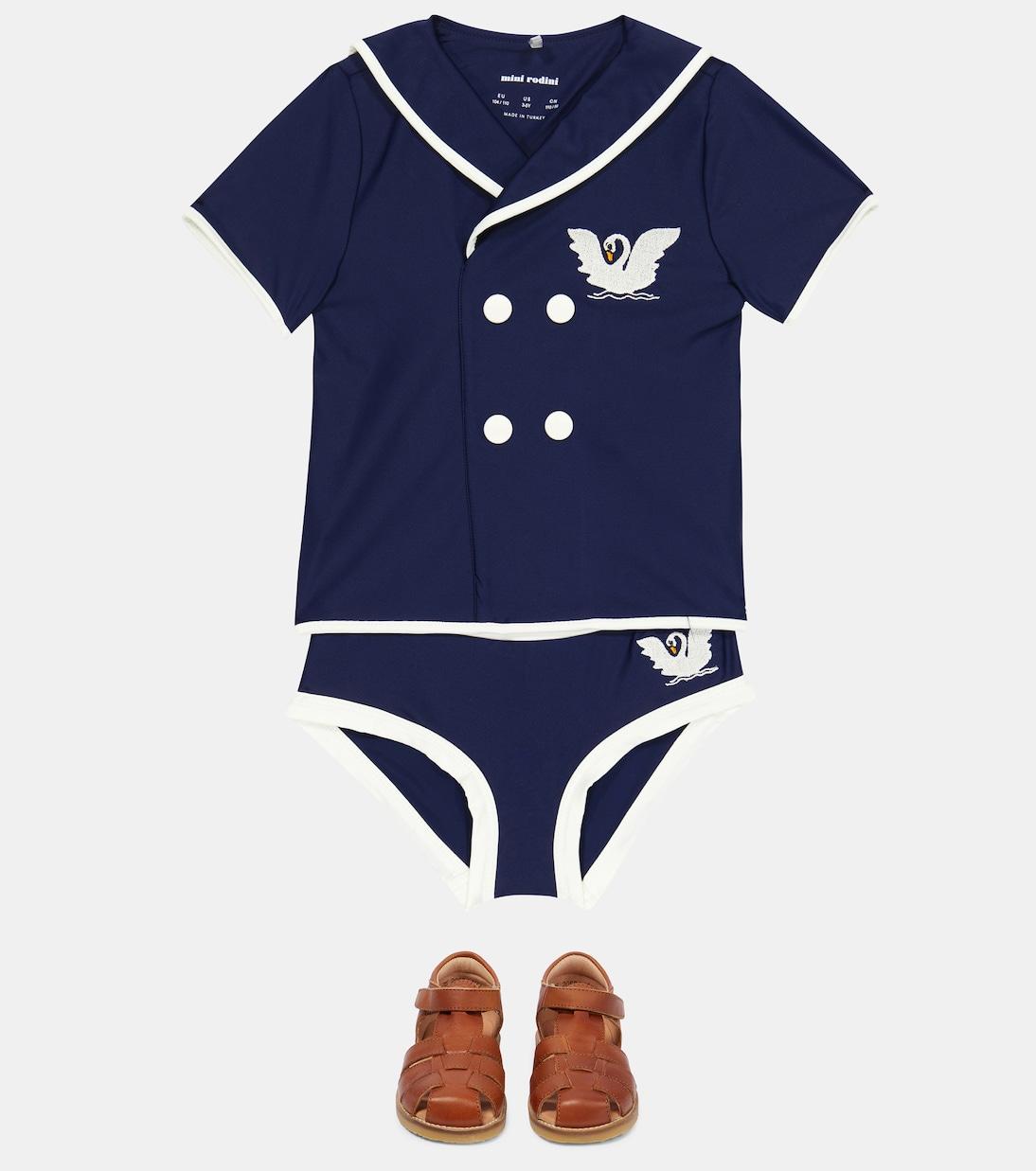 Защитите своего малыша стильно с этим купальником Mini Rodini. Изготовлен из темно-синего технического трикотажа с защитой от ультрафиолета UPF 50+, дополнен кантом, декоративными пуговицами и очаровательной вышивкой в виде лебедя на груди.