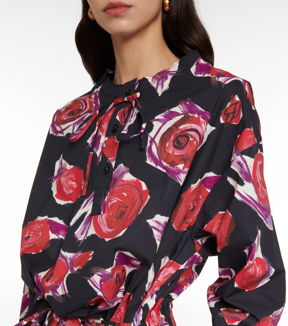 Знаменитые цветочные мотивы Marni ярко представлены в этом классическом миди-платье. Полностью хлопковый дизайн имеет полузастегивающуюся планку с кулиской на шнурке по горловине и тонкий тональный пояс, подчеркивающий обтекаемый силуэт.