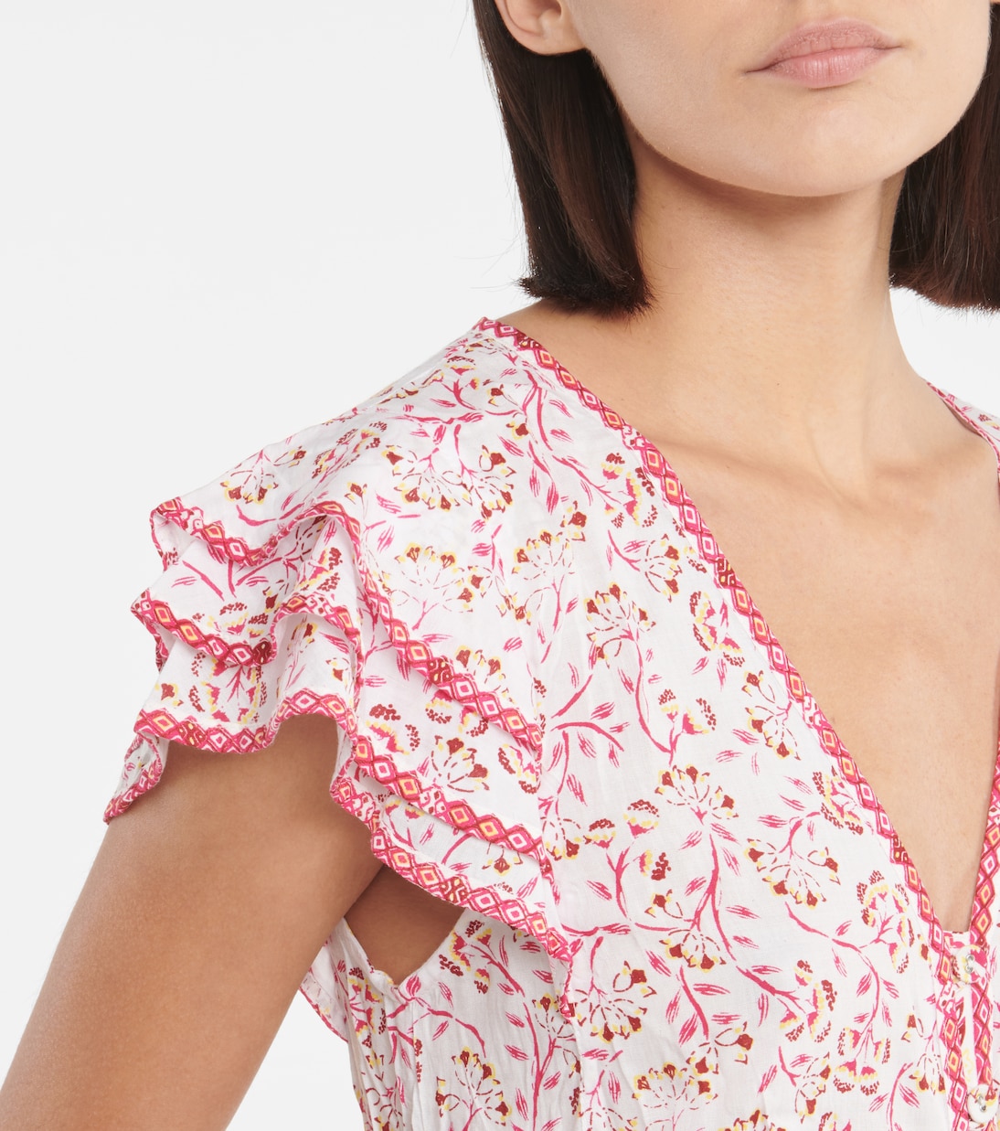 Зов теплых краев уже не за горами, когда вы надеваете розовое миди-платье Della от Poupette St Barth. Модель насыщена тонким цветочным принтом, а присборенная талия и блестящий перед на пуговицах вдохновлены винтажным дресс-кодом.