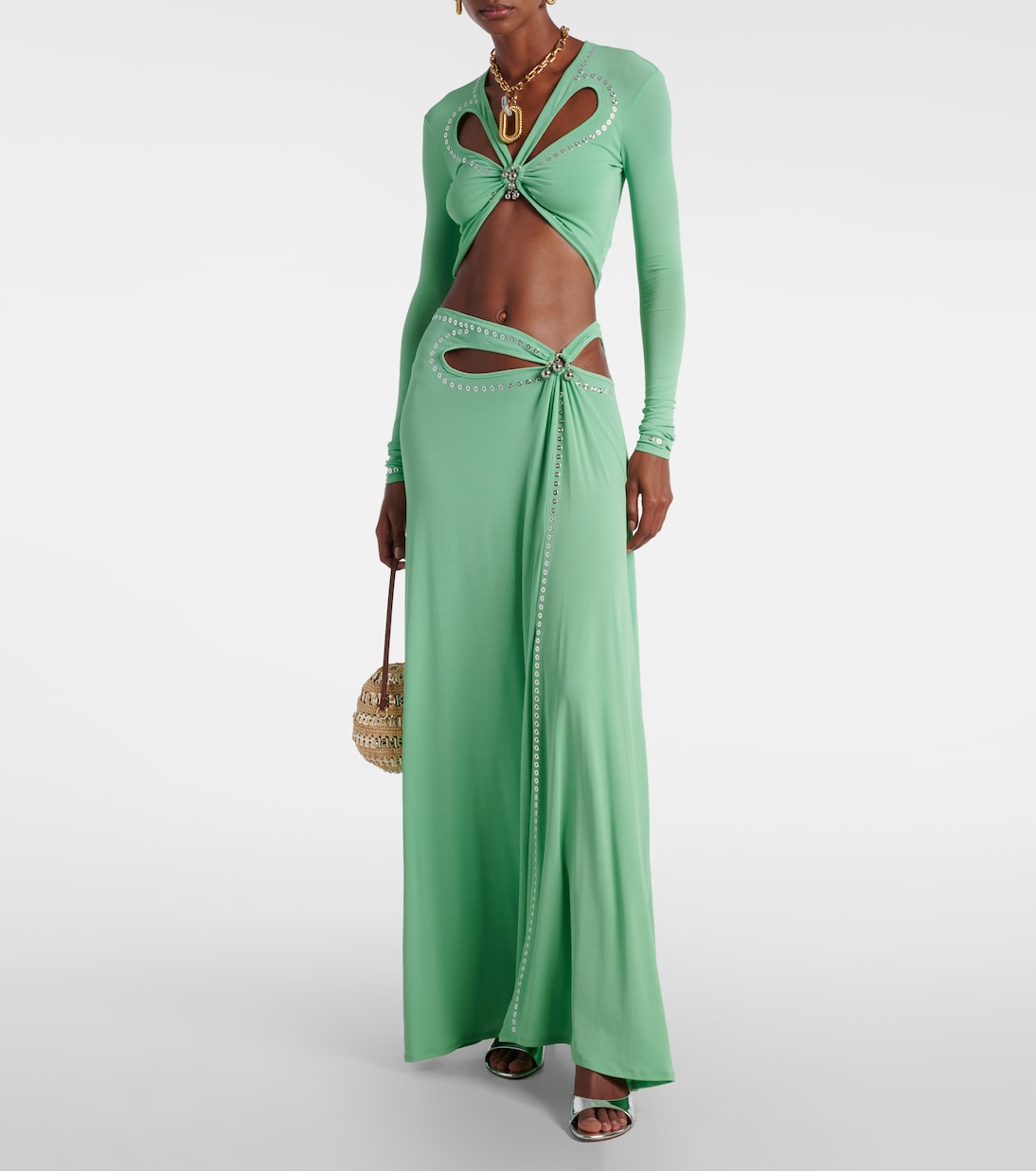 Известный своим гламурным дизайном с использованием неожиданных материалов, новаторский дух Рабанна продолжает разрушать границы. Эта очаровательная юбка макси с изысканными вырезами на талии украшена люверсами серебристого тона.