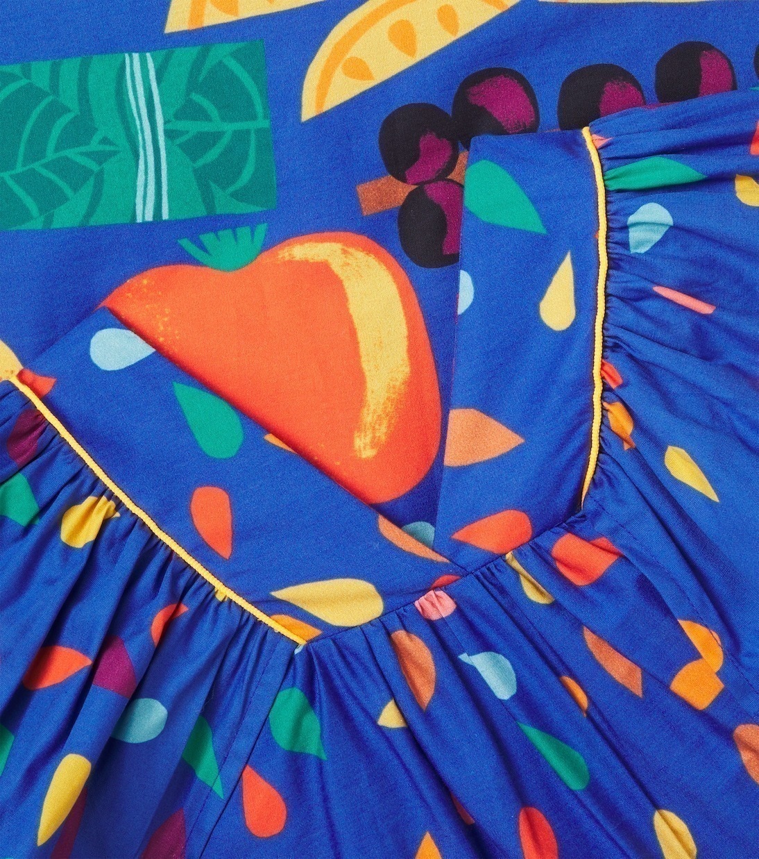 Изделия Fábula тщательно продуманы и полны той же яркости и радости, что и ее старший сестринский бренд Farm Rio. Это платье из чистого, приятного для кожи хлопка украшено очаровательным принтом и игривыми оборками на вырезе.