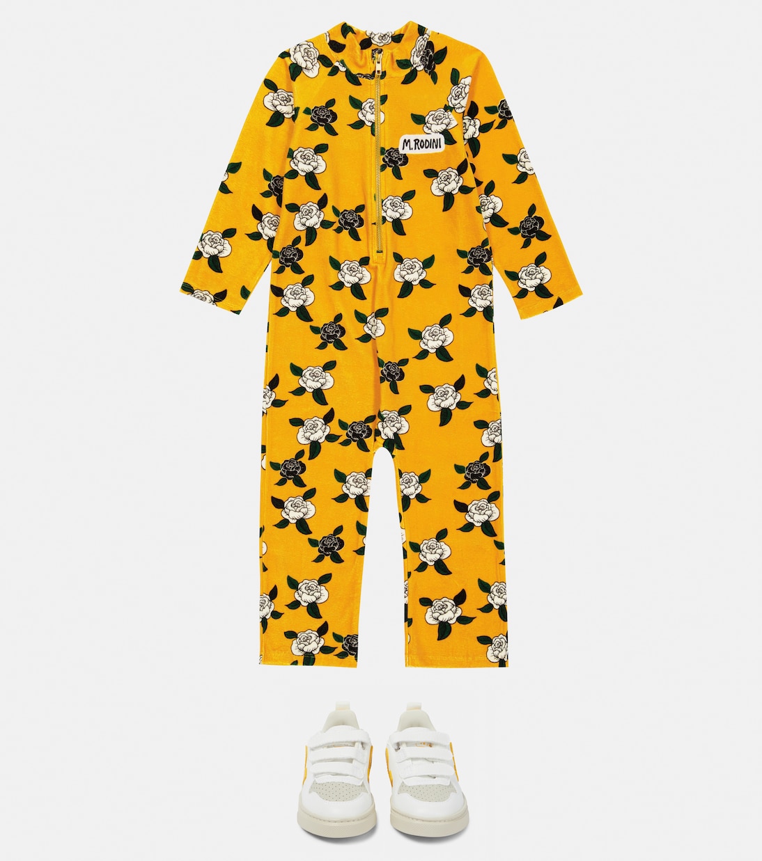 Изобретательный дизайн для творческих натур: этот комбинезон от Mini Rodini украшен графическим принтом роз по всей поверхности. Он выполнен из приятного на ощупь бархатистого хлопка для максимального комфорта и застегивается на молнию.